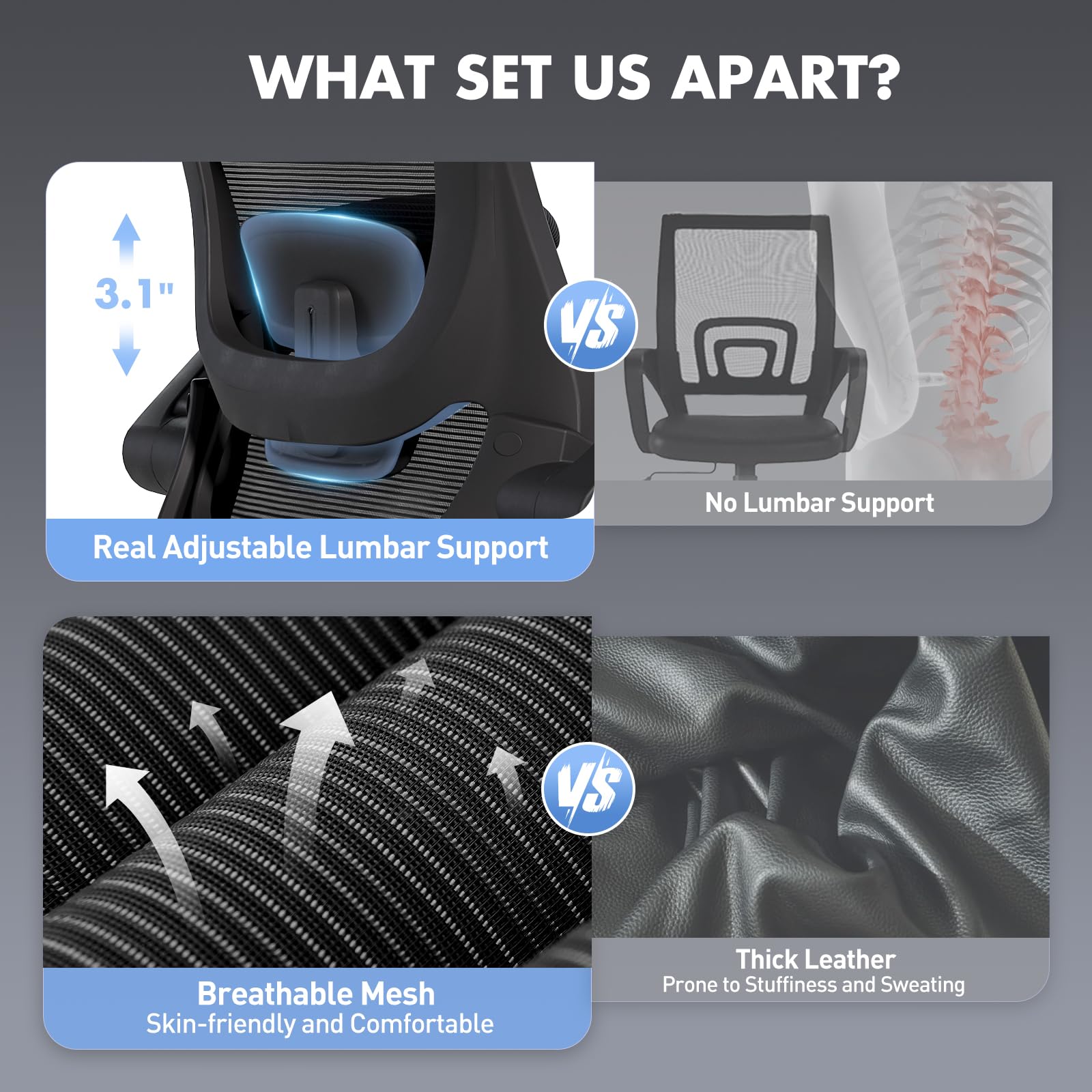 • 【No More Back Pain – Customizable Lumbar Support】 Say goodbye to slouching. Our adjustable lumbar system hugs your lower back exactly where you need it, aligning your spine and easing pressure. Ideal for long workdays or study sessions—because discomfort should never be part of your routine.
