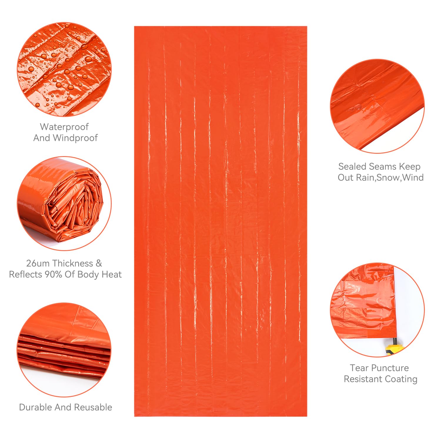 • Ultra-bright Reflective Surface: Trapped in the dark? Let this Survival Blanket Bag light the way. The bright orange emergency sleeping bag and its reflective surface will provide crucial visibility and help first res-ponders find you