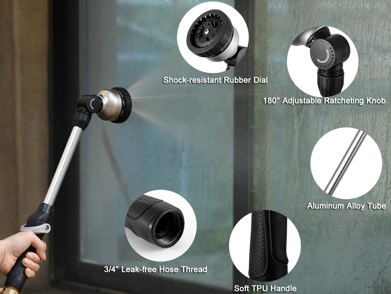 • 【100% HEAVY DUTY METAL HOSE WAND】Constructed with premium zinc alloy, aluminum alloy, and TPR for a tough lightweight and durable that's easy to grip and adjust. The shock resistant rubberized bezel dial can enhance durability & flexibility and withstand hard impacts & heavy force in daily drops and shocks. It is much stronger, more durable and long-lasting than plastic water nozzles.