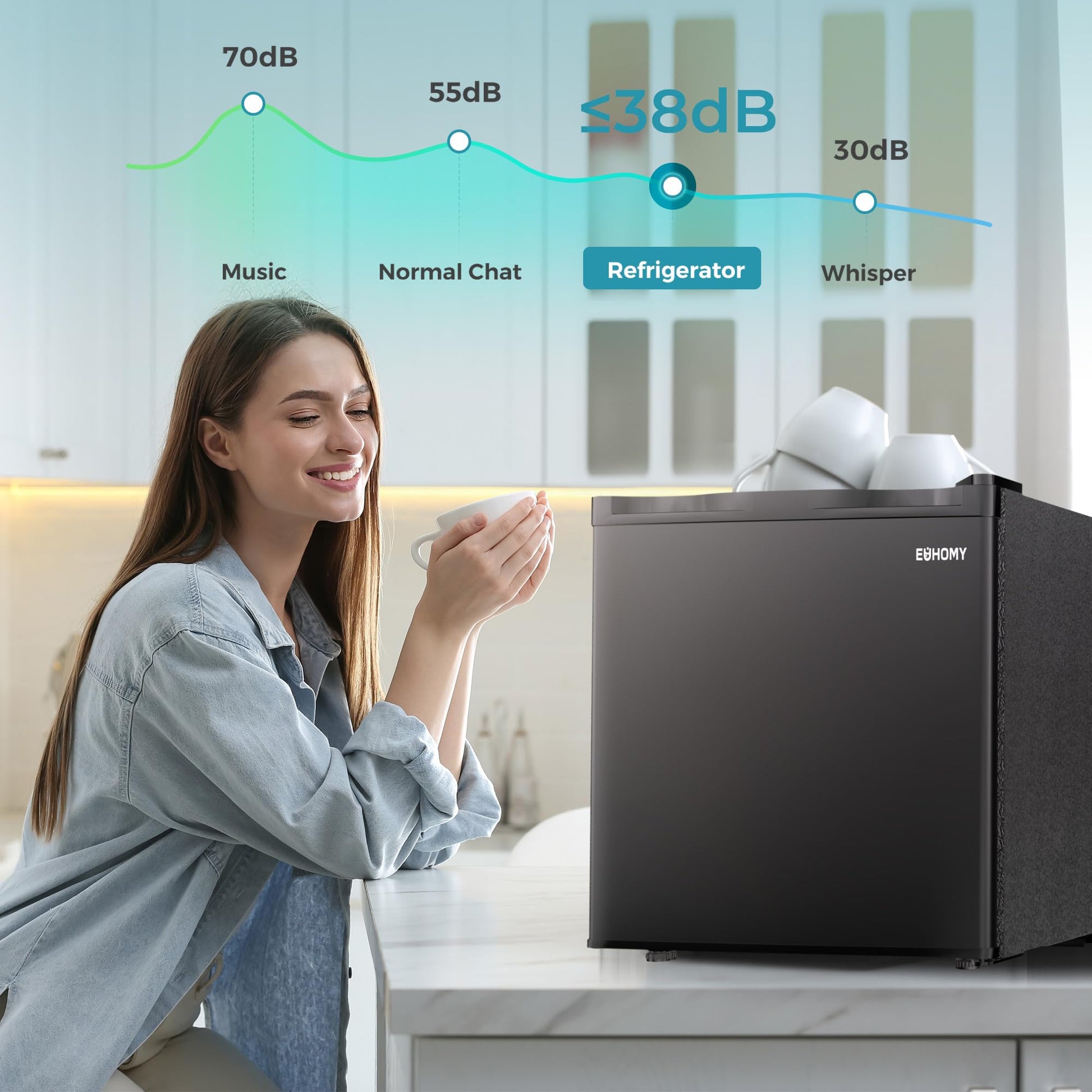 • ENERGY SAVING & QUIET - The mini refrigerator features a highly efficient and low-consumption compressor that uses only 0.55 kWh per day, ensuring optimal cooling with minimal energy consumption. The compact fridge operates smoothly and quietly, with a noise level of less than 38dB, making it suitable for use in any location
