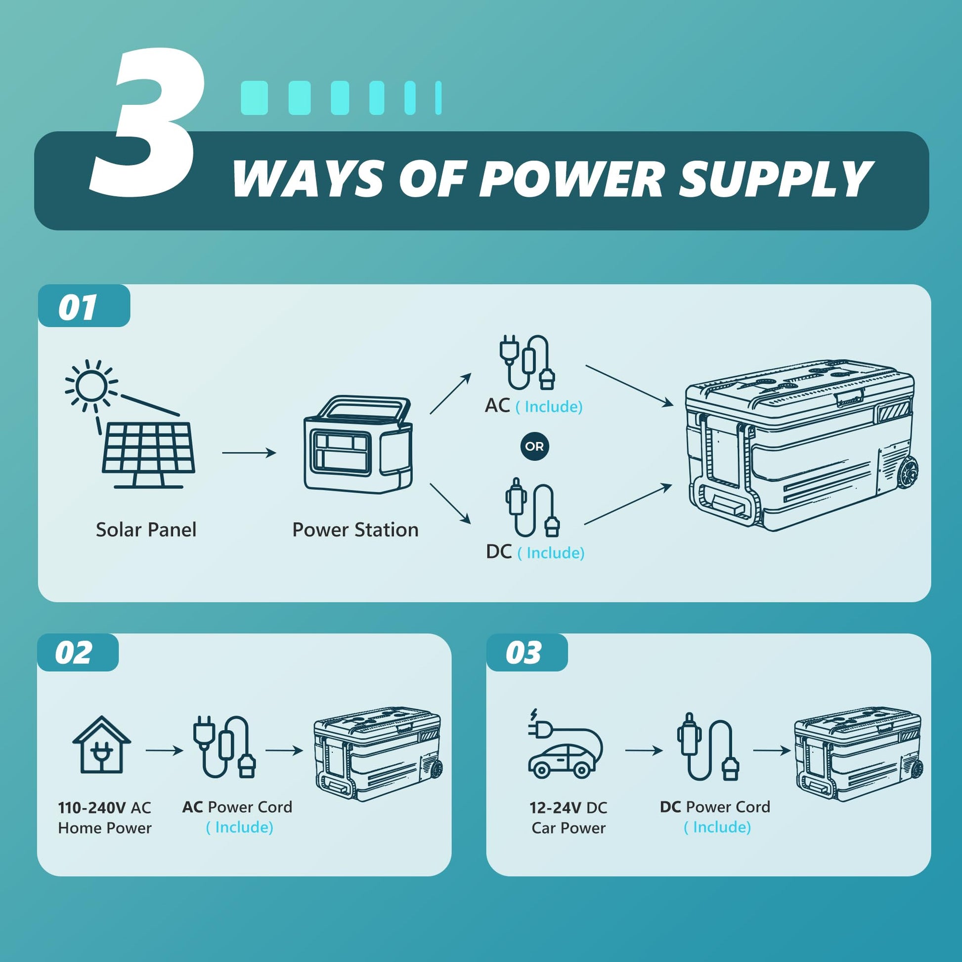 • Battery Protection & Multiple Power Supplies; The portable electric cooler freezer features a three-level battery protection system, adjustable from 9.6V to 12.4V in L/M/H modes, preventing overload or vehicle battery drain. This protection makes the car fridge suitable for use in sedans, SUVs, trucks, and most other vehicles. It can be powered by either DC or AC, making it versatile for various scenarios