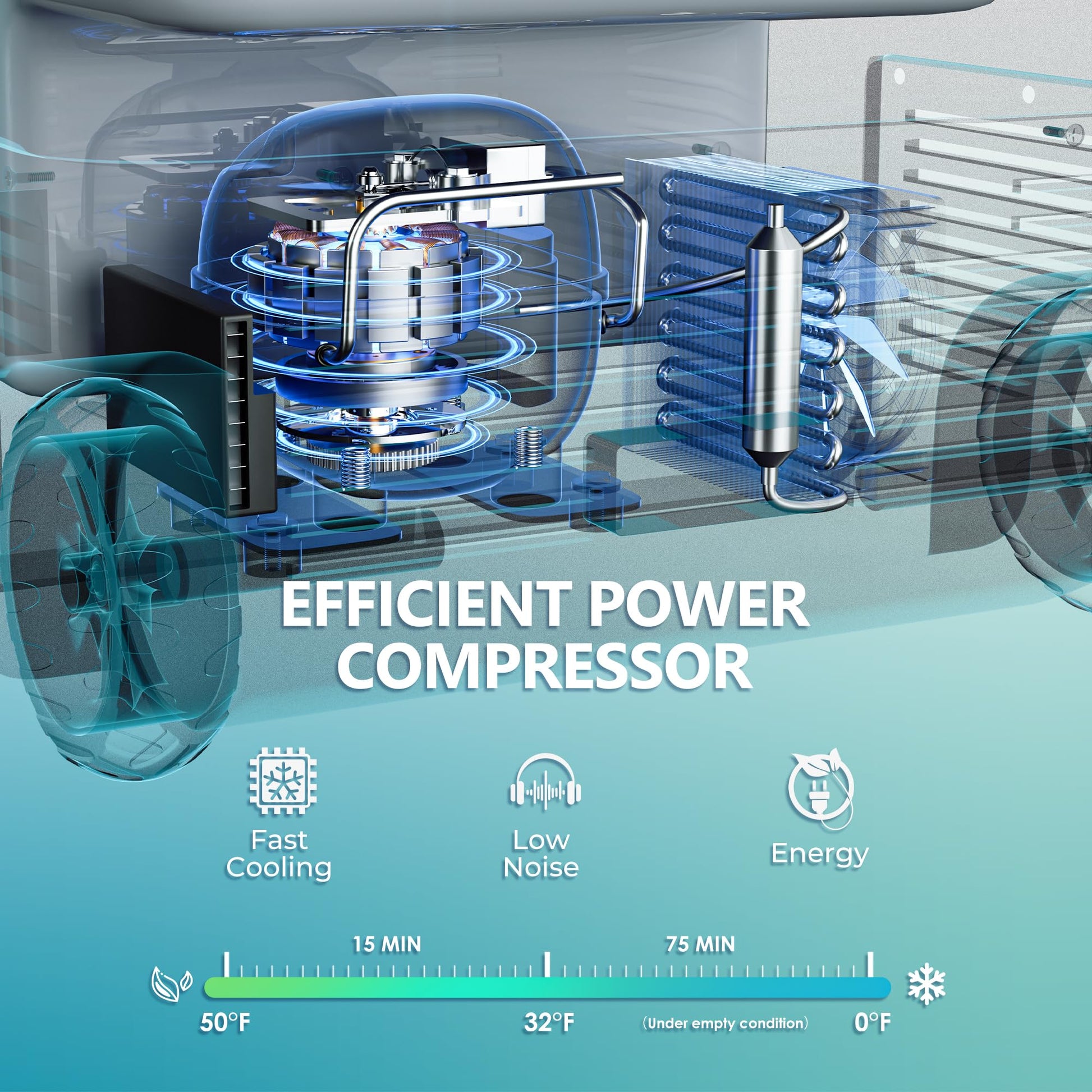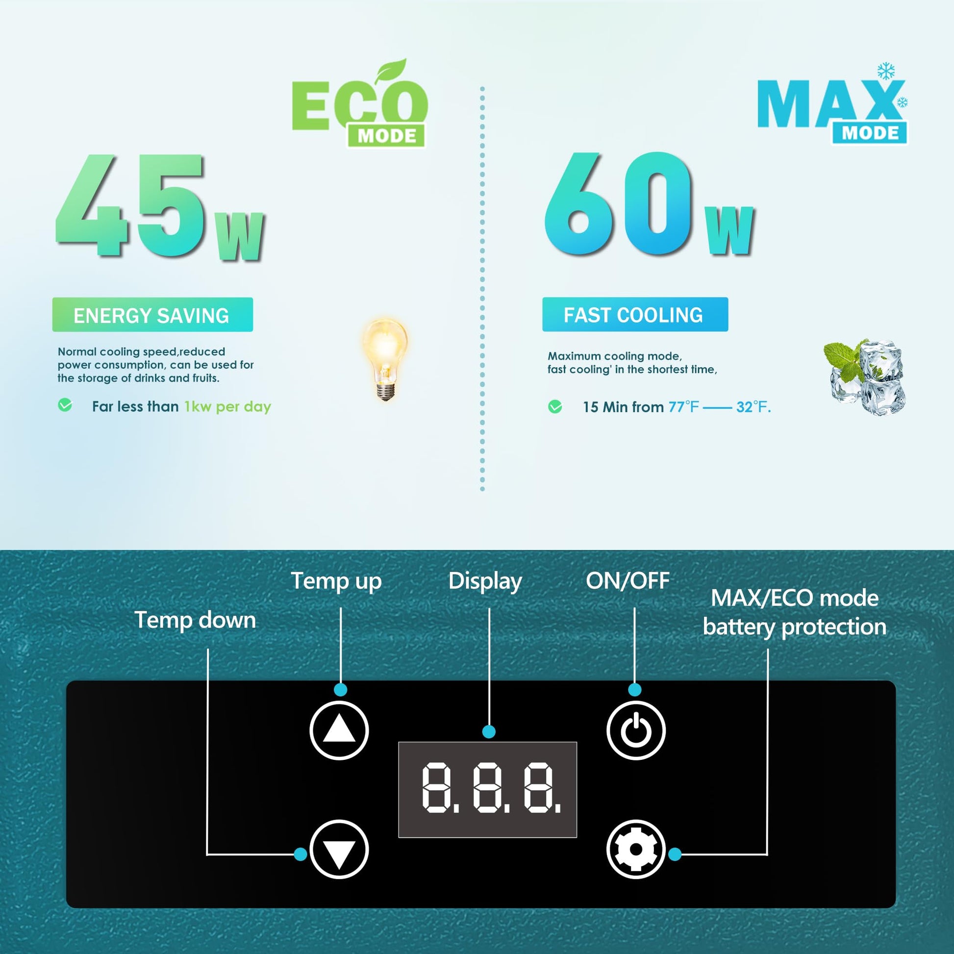 • Powerful Compressor & Excellent Insulation; The portable freezer is equipped with a high-efficiency variable frequency compressor, offering powerful cooling and a temperature range from 0°F to 68°F. UL energy-certified, the 12 volt cooler features both ECO and MAX cooling modes, consuming only 45W. The 40mm thick insulated, durable exterior ensures optimal temperature maintenance