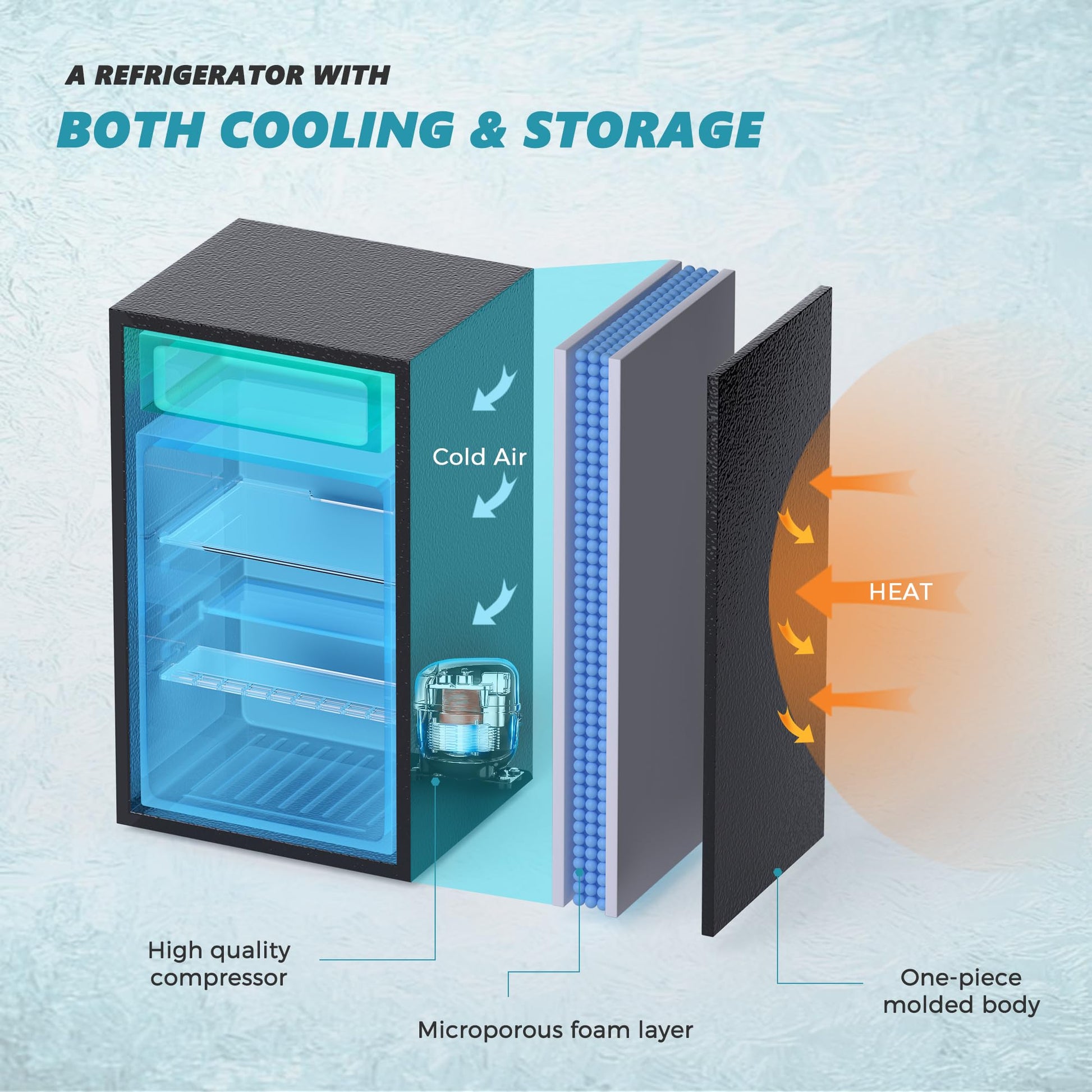• Detail Optimization - This small fridge runs at only 38dB, it is a quiet work of art. The frigobar mini has a 7-position temperature control knob, which can precisely adjust the temperature (Model 3 is recommended for daily use). The bottom of the refrigerators are equipped with adjustable feet, which makes it easy to adjust the placement angle of the rv refrigerator on uneven ground