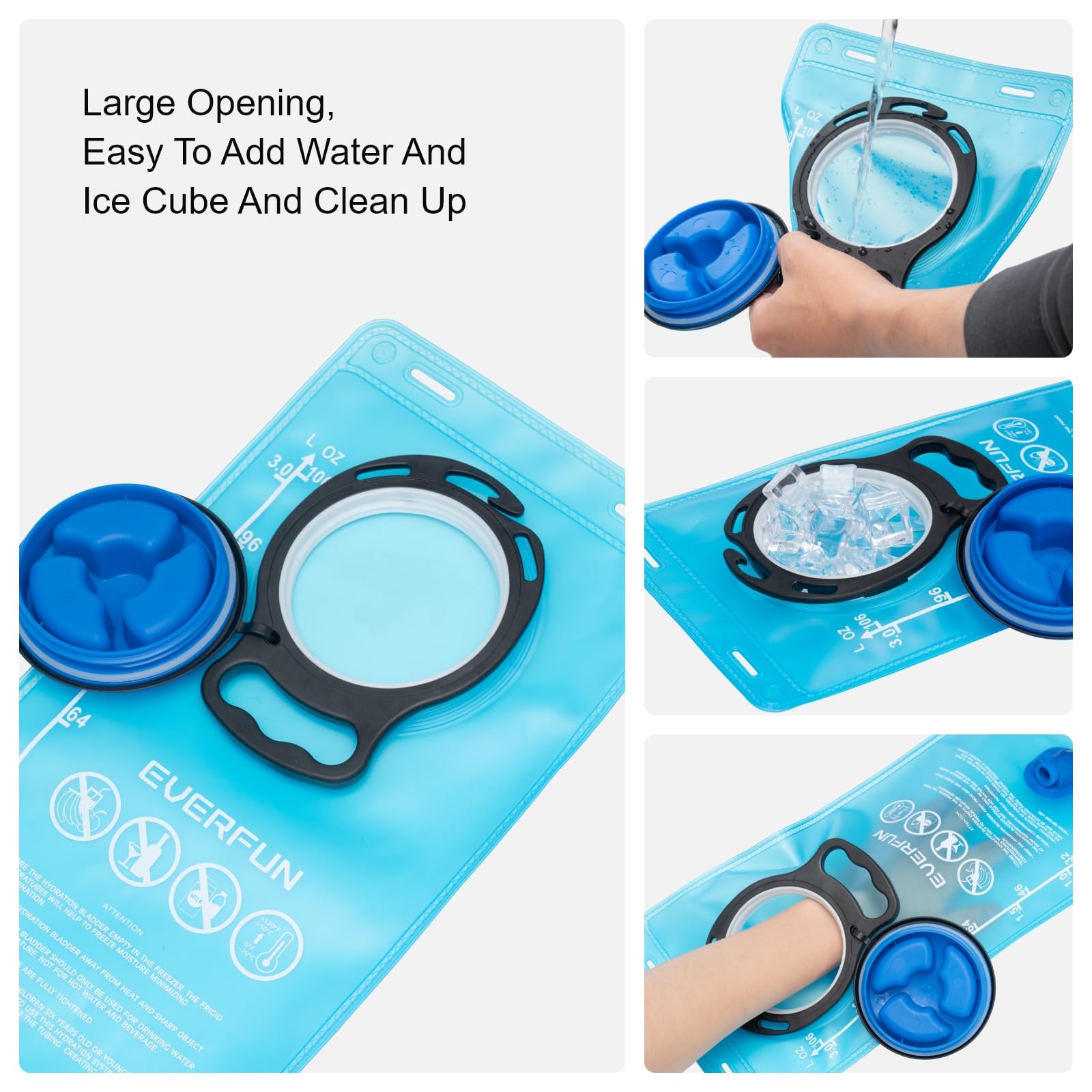 • EFFICIENT HYDRATION SYSTEM: This 18L hydration backpack includes an UPGRADED 100 oz / 3-LITER water bladder made of FOOD-GRADE PEVA material. The water Pouch has a Large Opening for easy refilling with water, ice cubes and cleaning. The high-flow bite valve is ergonomically designed for more comfortable use. The mouthpiece cover protects the bite valve against dirt and damage.