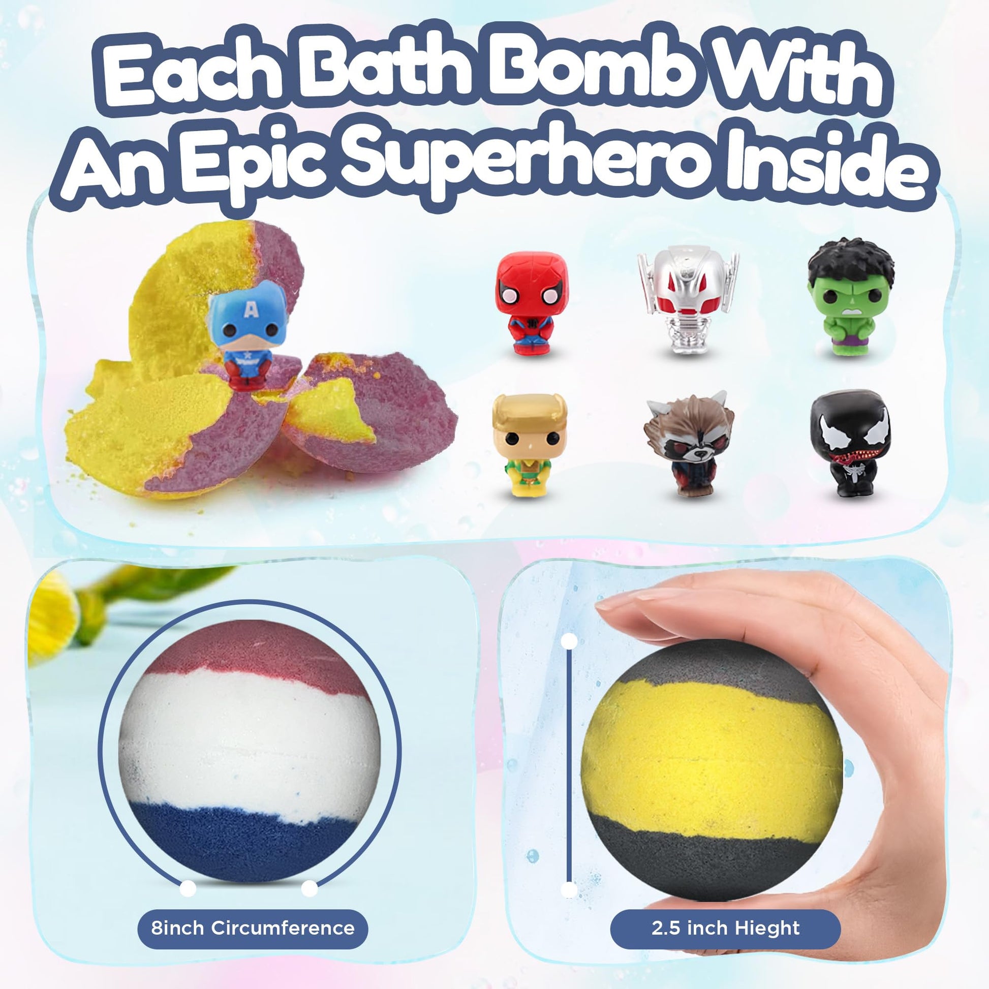 • Kids Bath Bombs for Boys with Surprise - Our non toxic kids bath bombs are designed to be safe & fun. Our superhero bath bombs for boys with toys hidden inside make the best superhero gift. Kids love discovering an epic super hero character bath toy is found in each fizzy bathbomb.