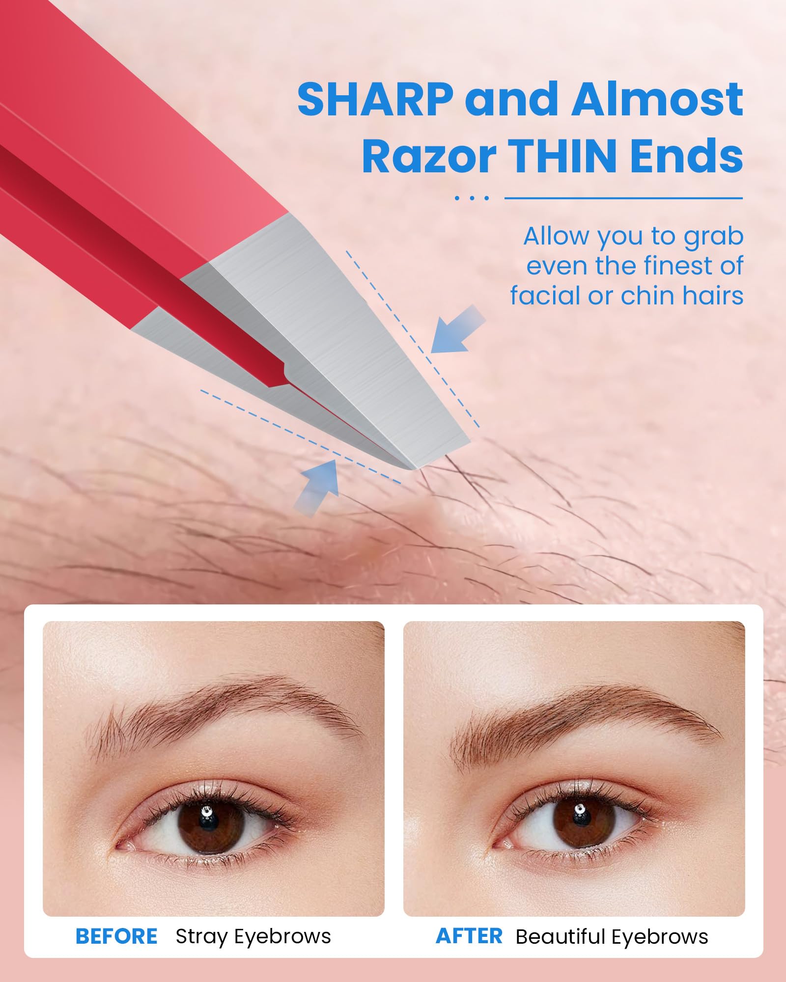 • 【Sharp SLANT TIPS for Every Hair】25° slanted tip is the perfect angle for removing unwanted hair. These ultra-fine tips grip the tiniest hairs effortlessly - from peach fuzz to stubborn chin hairs. Unlike flimsy tweezers, our professional-grade design removes hairs cleanly without breakage. Perfect for women's facial hair care routines and men's grooming kits alike.