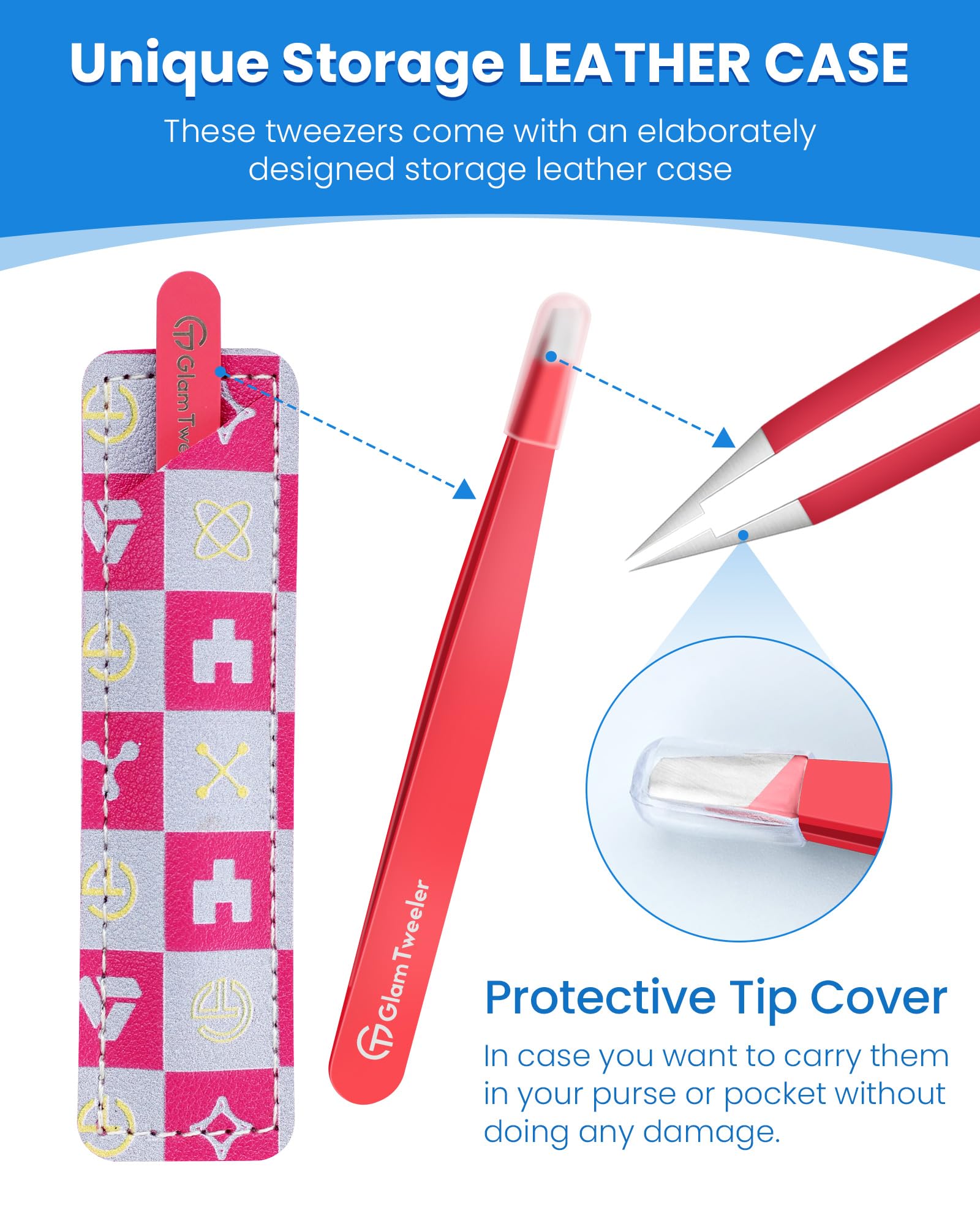 • 【Exclusive TRAVEL-READY Storage case】The GlamTweeler Expert Slant Tip Tweezers come with an elaborately designed storage leather case, which makes it easy and safe to carry in purse or for travel. This elegant storage pouch not only protects the tip's sharpness but also helps prevent accidental damage when not in use, very useful and convenient.