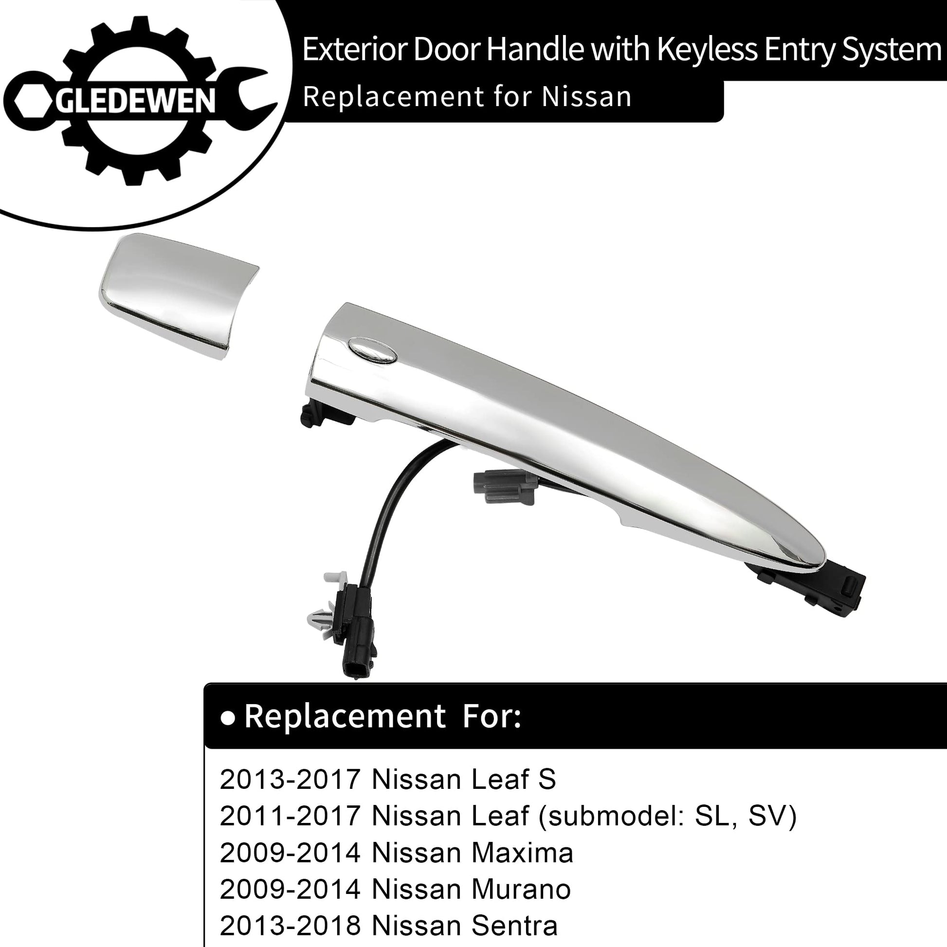 Details: Packing List: 1x Outside Chrome Door Handle Front Left Driver Side, With Smart Entry System and RFID (Radio-Frequency Identification) Sensor 1x Outside Chrome Door Handle Front Right Passenger Side, With Smart Entry System and RFID (Radio-Frequency Identification) Sensor Condition: New Compatible with: 2013-2017 replacement for Nissan Leaf S 2011-2017 replacement for Nissan Leaf (submodel: SL, SV) 2009-2014 replacement for Nissan Maxima (submodel: S, SV) 2009-2014 replacement for Nissan Murano (submodel: LE, S, SL) 2011-2014 replacement for Nissan Murano (submodel: CrossCabriolet, SV) 2013-2016 replacement for Nissan Sentra FE+S 2013-2014 replacement for Nissan Sentra FE+SV 2013-2018 replacement for Nissan Sentra (submodel: S, SL, SR, SV) 2017-2018 replacement for Nissan Sentra (submodel: Nismo, SR Turbo) Precise Fit Part Numbers: 80646-9N00A, 806469N00A, 12459871, 80640-3SG0A, 80640-9N00A, 806451AA0A, 80640-1AA0B, 806403NA0A, 80640-3NA0AFL, 806403SG0A, 806409N00A, 80645-1AA0A, 806401AA0B, 80640-3NA0A, 826469N00A, 806461AA0A, 806469N00A Broken door handle? Can't get in your car? Are you searching for the highest quality, best replacement value door handle? We deserve it. Our Door Handle kit, to replace your old or broken part, will meet or exceed OEM standards.