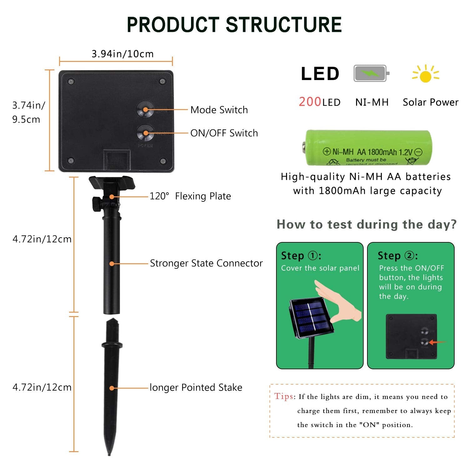 • 2025 New Upgraded Solar Fairy Lights Outdoor Waterproof: Super Bright 2-Pack Each 72ft 200 LEDs String Lights with Upgraded LED Bulbs, Higher Conversion with Larger Size Solar Panel, Larger Capacity Battery(1800mAh), IP65 Waterproof Performance.