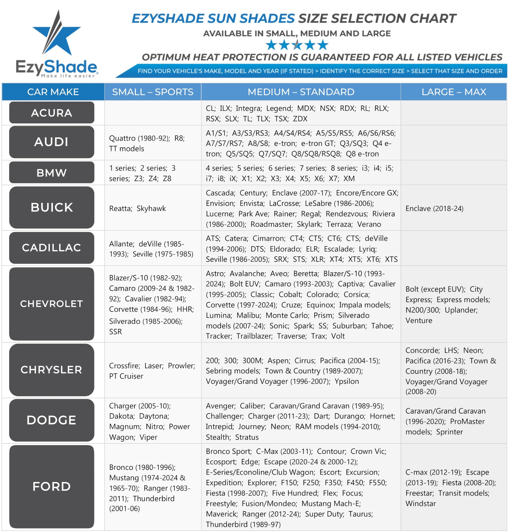 EzyShade Windshield Sun Shade with Shield-X Reflective Technology. See Size-Chart with Your Vehicle. Foldable 2-Piece Car Sunshades Reflect UV Sun and Heat and Protect Your Car. Standard (Medium) Size