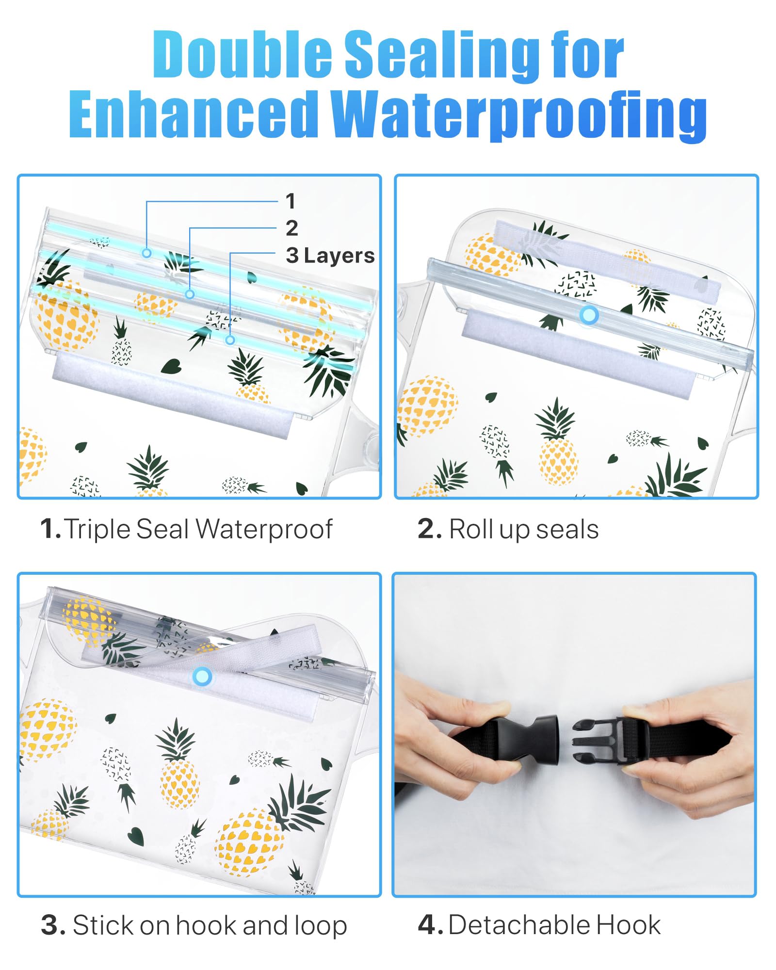 Waterproof Protection - This waterproof fanny pack is designed with triple push zip-lock seals and a roll-top velcro closure to keep your valuables dry and secure; Your cruise essentials 2025 must haves! Keep Your Valuables Close - Measuring 9 x 6.5 inches and weighing only 0.22lb, the lightweight waterproof pouch fits an iPhone 15 Pro, 2 passports, 1 car key, 6 cards, several bills unfolded or other travel beach kayak boat accessories, and keeps them handy without needing to rent a locker. Hands-free for Water Sports - The waterproof bag with waist strap works as a waterproof waist pouch carrying your valuables and frees up your hands, so you can fully enjoy surfing, kayaking, paddle boarding, raft, fishing, water parks or other water sports. Touchscreen Friendly - The waterproof fanny pack for women features a touchscreen-friendly design, allowing you to check messages or answer calls without removing your phone from the bag. Adjustable Waist Strap - Equipped with an adjustable, comfortable waist strap, the waterproof waist bag can be customized to fit various waist sizes (29-45 inches) and can also be adjusted to wear as a crossbody or shoulder bag for storing cruise accessories must haves!