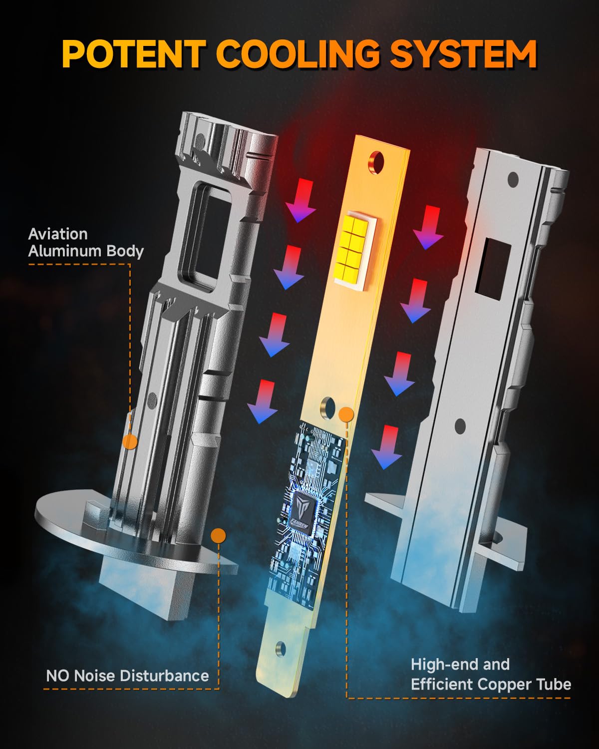 • Over 6,0000 Hours Lifespan: This H1 bulb offers over 60,000 hours of use, made from aviation aluminum and a large copper baseboard. A high-speed cooling fan efficiently dissipates heat, ensuring stable illumination without frequent replacements.