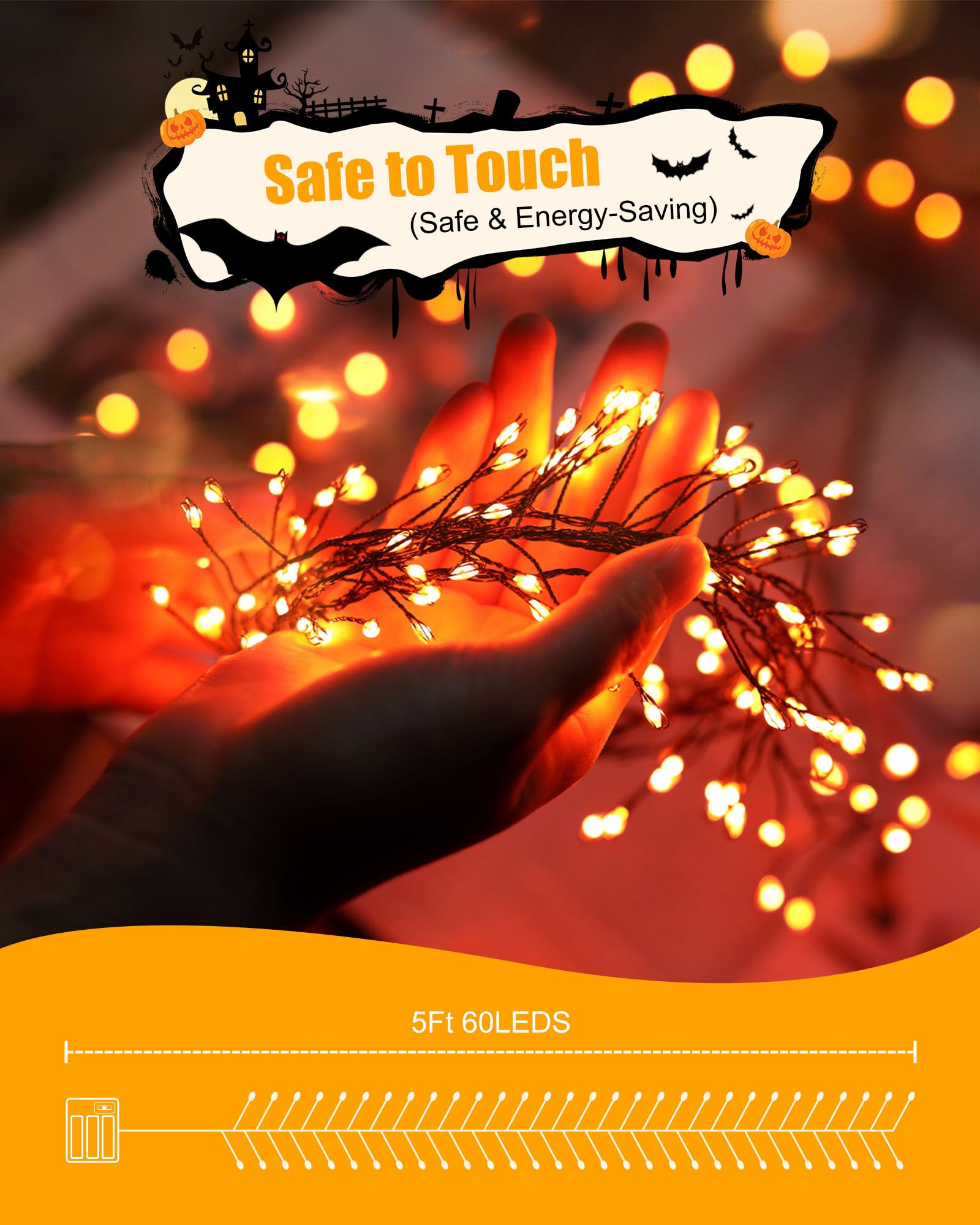 Fairy Lights Battery Operated, Twinkle String Lights Waterproof Silver Wire 5 Feet 60 Led Firecracker Starry Lights for DIY Wreath Home Party Bedroom Mason Jar Indoor Halloween Decoration, Orange