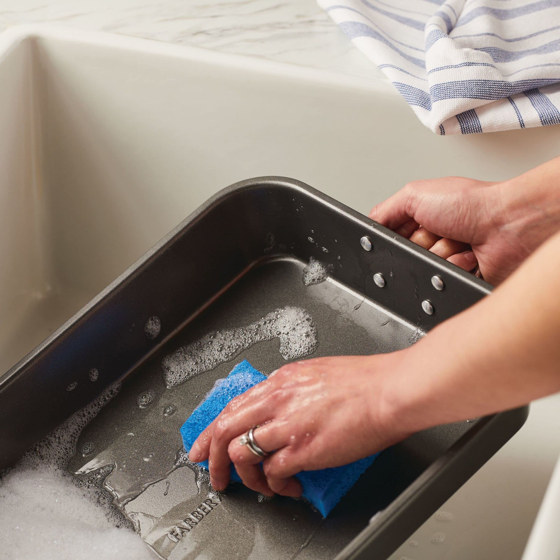 Details: For over 100 years, Farberware has provided reliability, value, and performance to generations of home cooks, and upholds that tradition with every piece of sturdy and dependable bakeware, like this Farberware Bakeware 11-Inch x 15-Inch Nonstick Roaster with Flat Rack. The roasting pan features a removable, chrome-plated flat rack which raises meat up to allow fats to drip away. Perfect for pork roasts, legs of lamb or small turkeys, the roasting pan also works ideally for roasting fish or vegetables. With heavy duty steel construction, the durable roaster resists warping and heats evenly to help reduce hot spots that can burn foods. Nonstick inside and out - thoughtfully designed and responsibly made without PFAS, PFOA, lead, or cadmium* - delivers great food release with quick cleanup after family meals. Sturdy chrome-plated handles provide a confident grasp when lifting the roasting pan and transferring between kitchen stations. Oven safe to 450 degrees F, this nonstick roaster makes an ideal addition to many other bakeware and cookware pieces in the Farberware collections. Depend on this durable Farberware Bakeware 11-Inch x 15-Inch Nonstick Roaster with Flat Rack to help create mouthwatering roasts, hams and more. *Product design does not involve intentionally adding to the interior nonstick coating any of these substances which may otherwise be present in the environment.