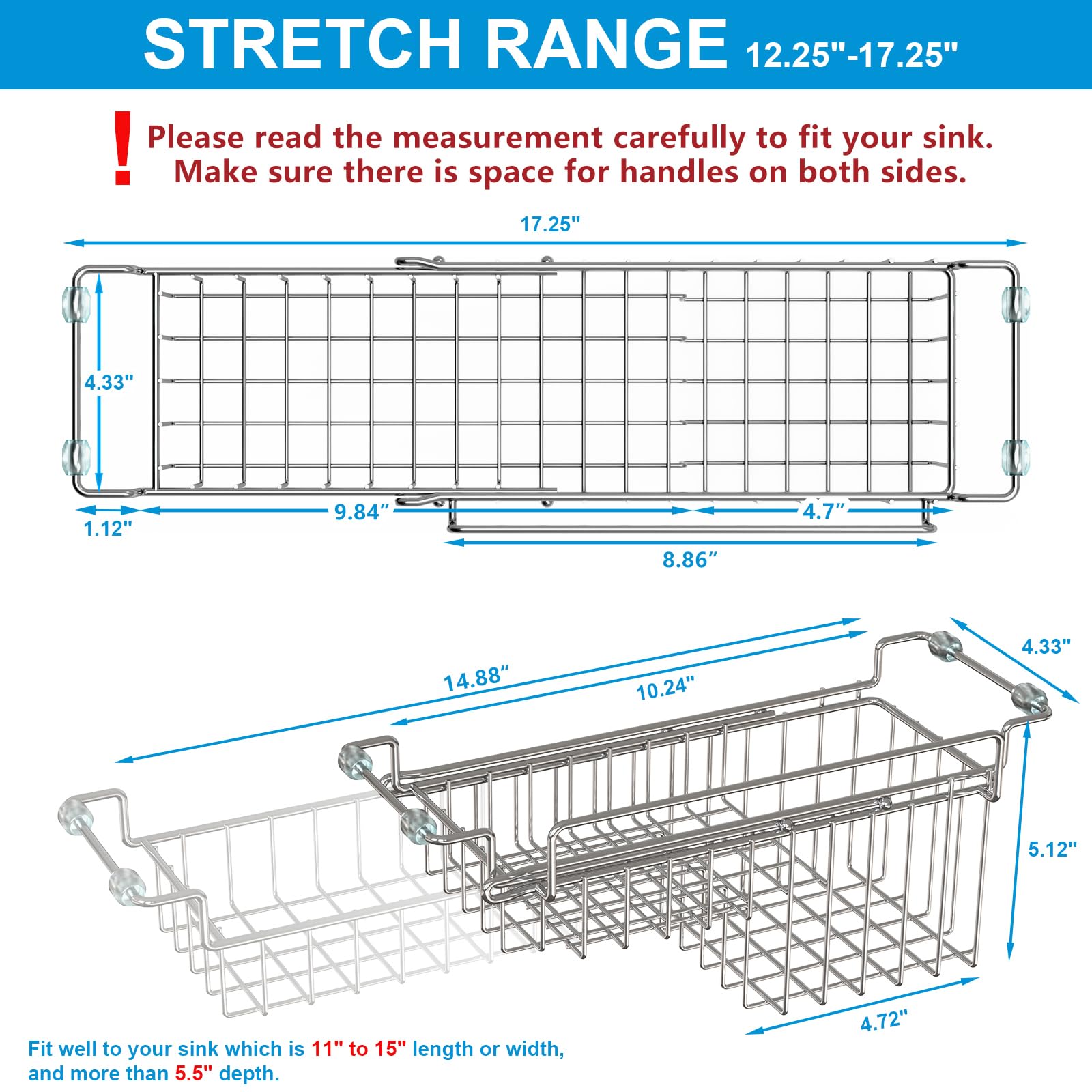 • POWERFUL EXPANDABLE DESIGN - The innovative kitchen sink organizer expands from 12.25' to 17.25' wide, increasing the available storage space and is more flexible than other over the sink caddy. Fit well to your sink which is 10 to 16.75 inches length or width. Make sure to measure your sink first.