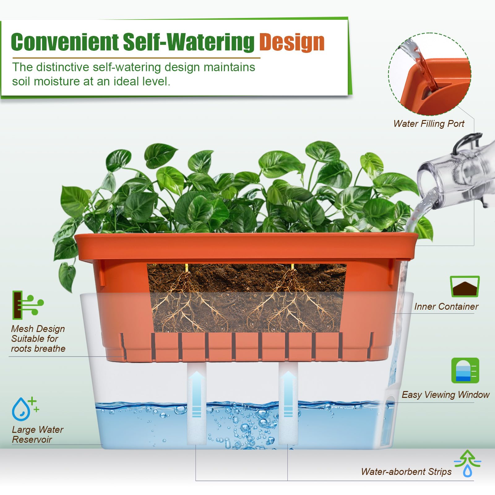 Fayavoo Self Watering Plant Pots, Set of 3 10.5 Inch Rectangular Windowsill Herb Planter Box, Modern Plastic Flower Pots for Indoor Outdoor Garden Office Patio, Planters with Drainage Hole Hidden Tray