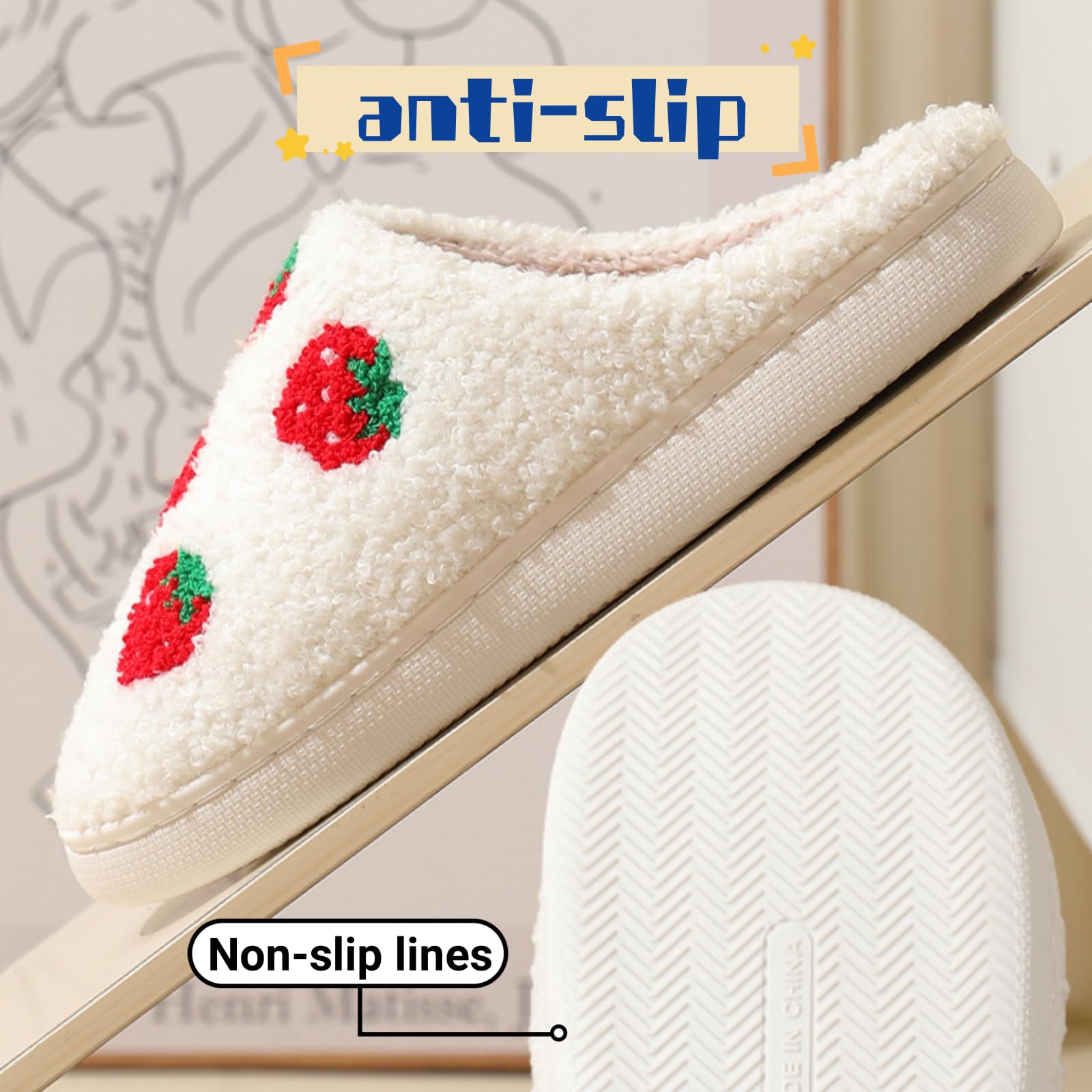 • 【Soft Comfy Material】: This Fluffy Cloud strawberry cute slippers are available in 2 soft skin-friendly materials with Faux Fur Lining, very soft and will free your feet, making you walk comfortably all time,wraps your feet in an breathable warm and natural lining