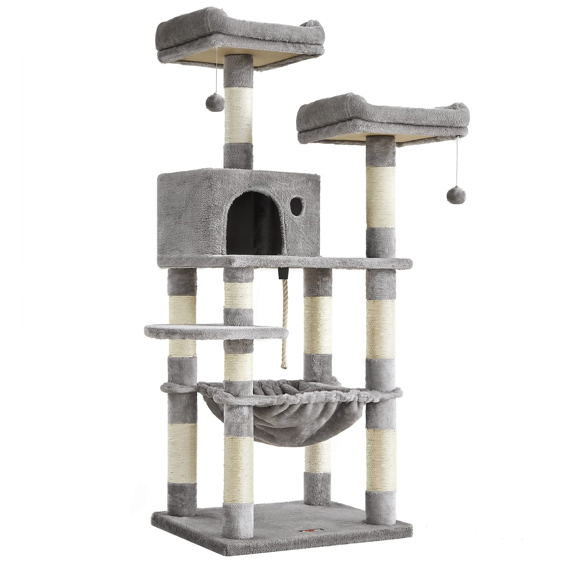 FEANDREA Cat Tree, Cat Tower for Indoor Cats, 56.3-Inch Cat Condo with Scratching Posts, Hammock, Plush Perch, Light Gray UPCT15W