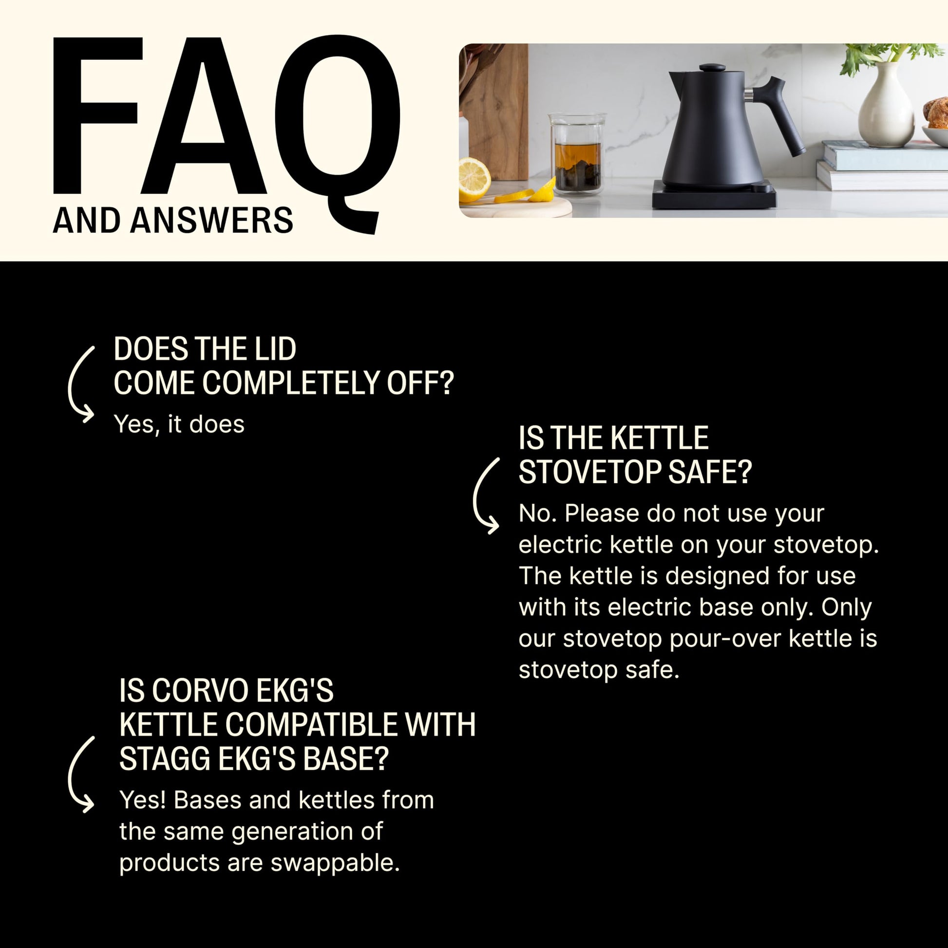 • CARE FOR PRODUCT: On a regular basis, remove any mineral deposits which will develop as stains on the bottom of the kettle. This process is natural and expected for all electric water kettles. Corvo EKG Pro is not dishwasher safe.