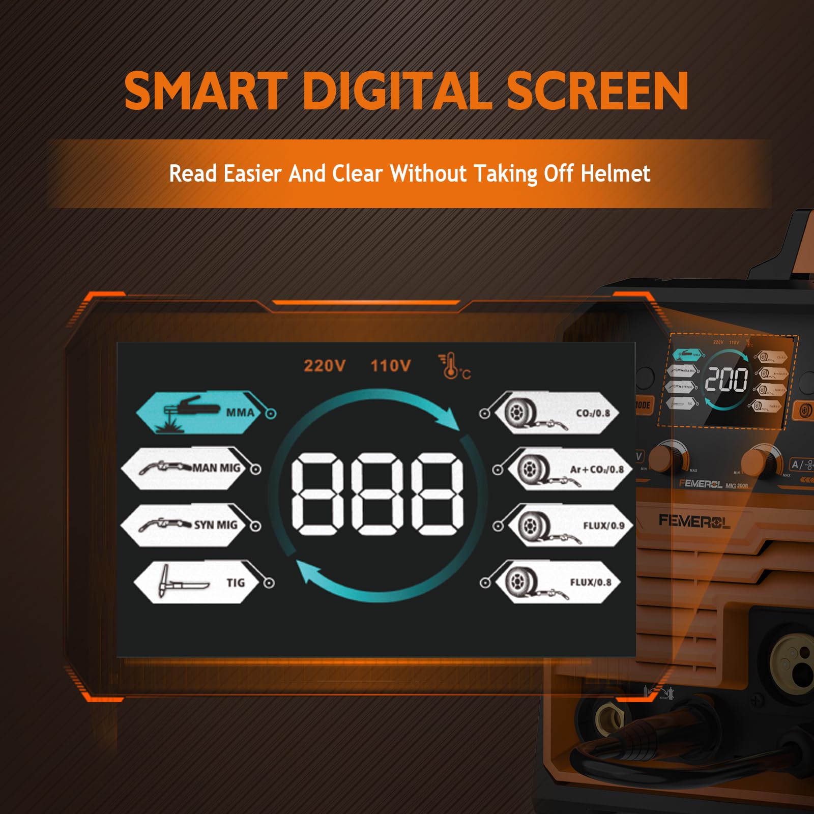 FEMEROL 200A MIG Welder,4 in 1 Gas MIG/Gasless Flux Core/Stick/Lift TIG Multi-process Welding Machine Large LED Display 110V/220V Multi Welder