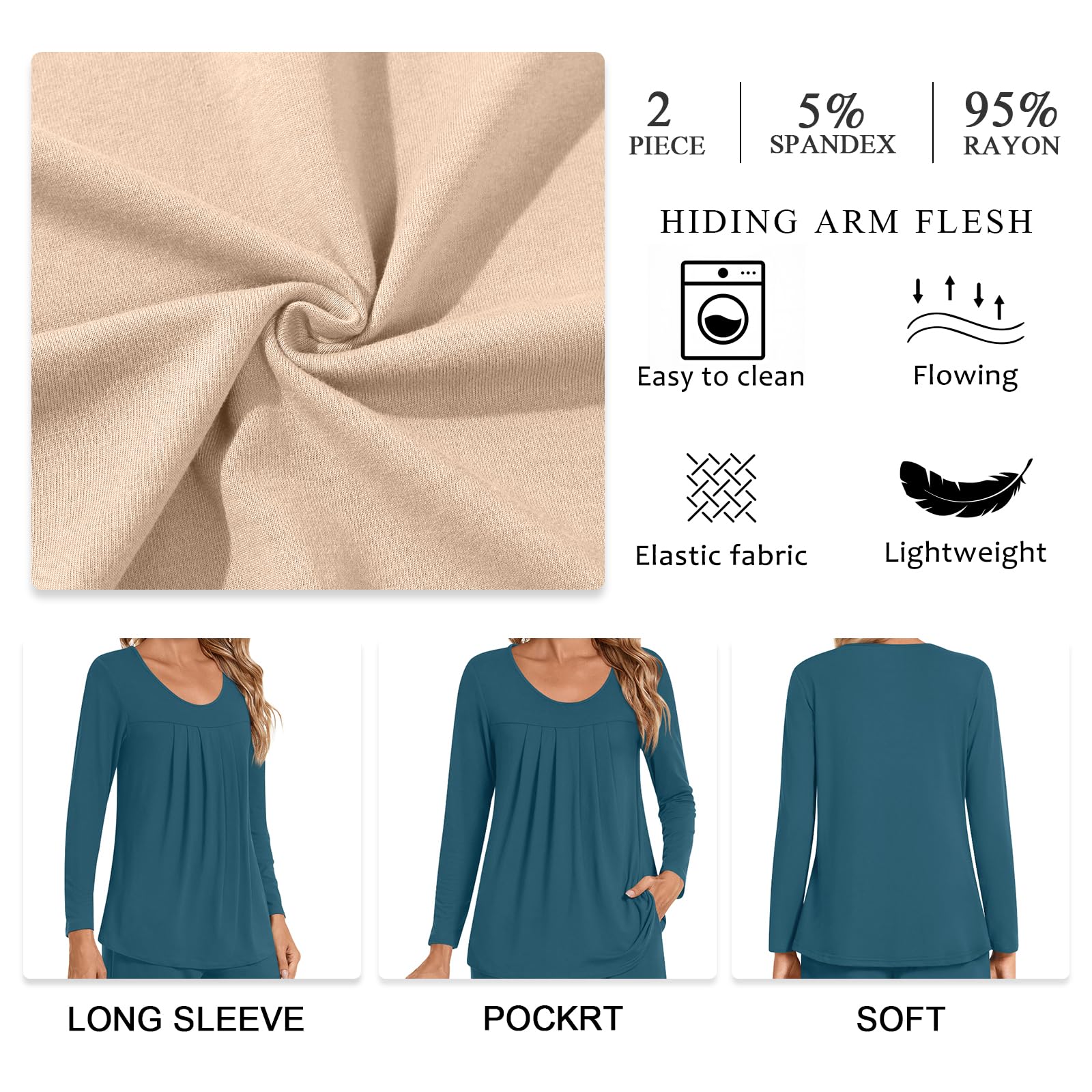 • Material : Findsweet women's pajama set is made from 95% rayon and 5% spandex. This material is soft and comfortable, has great stretch, washes and dries well, and doesn't wrinkle