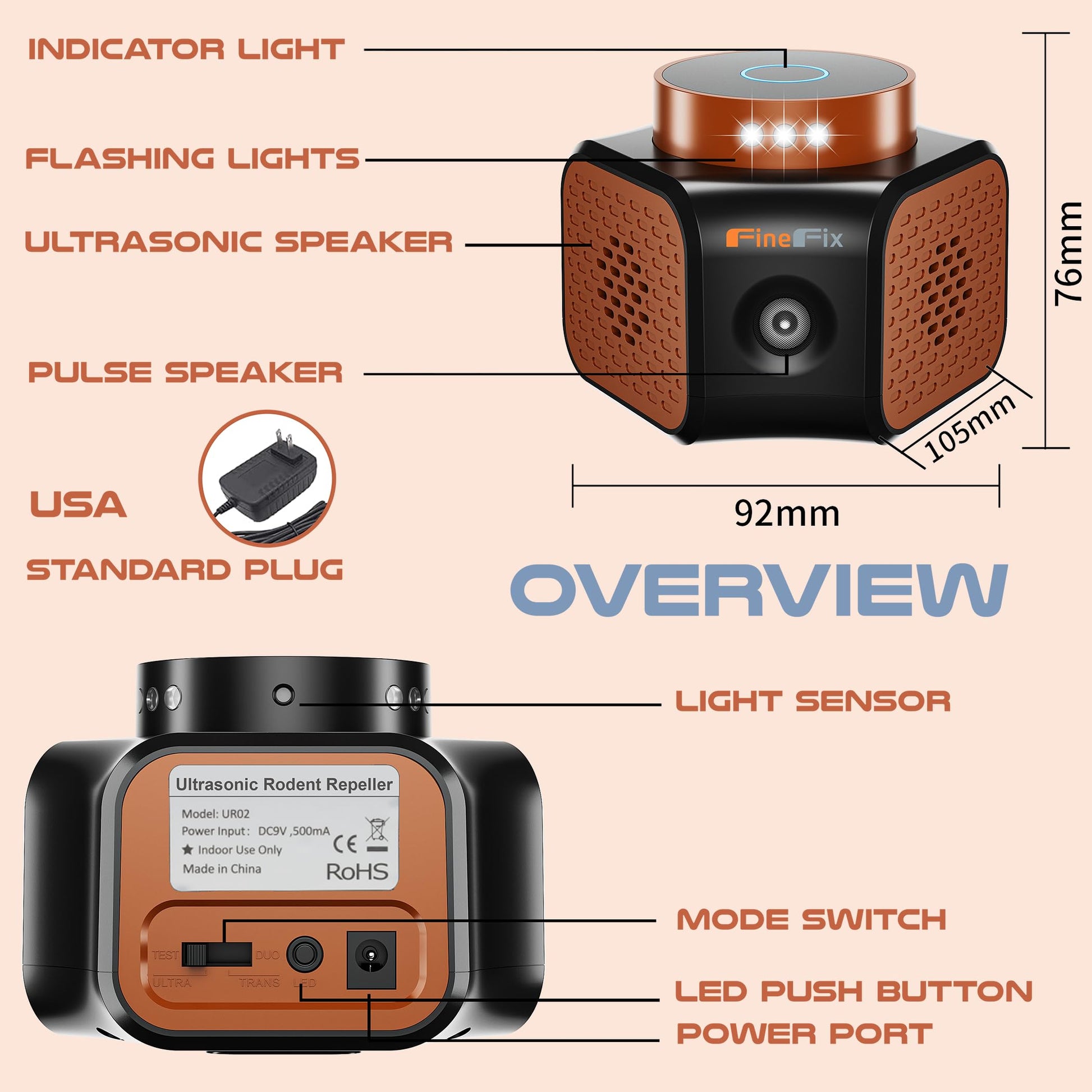 • VERSATILE 4 MODES SOLUTION: FineFix ultrasonic mouse repellent plug in is a modified ultrasonic pest repellent ultrasonic plug in device with 4 specialized modes designed to combat different types of pests. From the Test mode for ultrasound verification to the ULTRA, TRANS, and DUO modes, these electronic mouse repellent devices ensure your living space is fully protected and that there are no creepy crawlies invading your sanctuary.