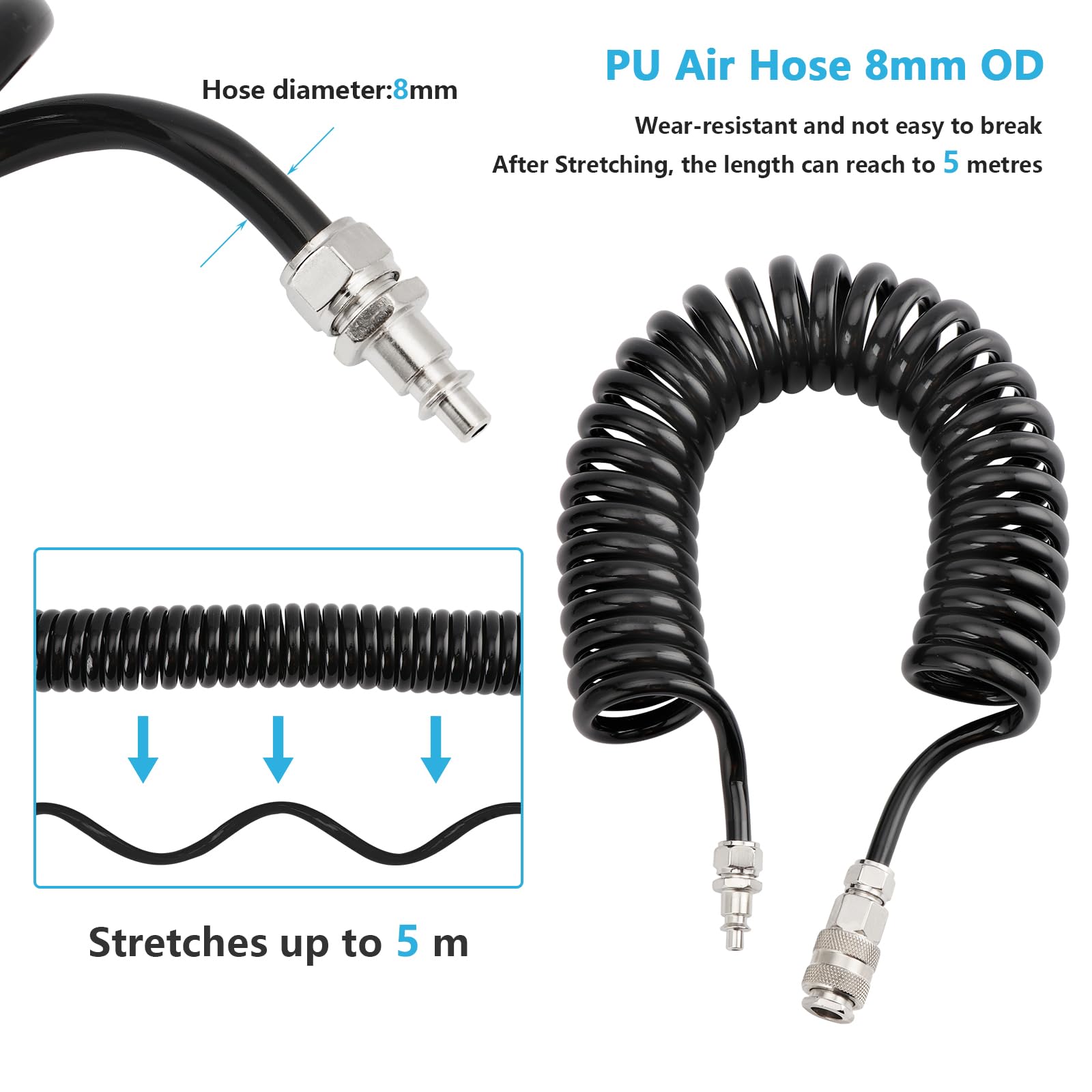 • Premium Air Hose: The recoil air hose is made of High quality PU material, Air hose coil OD = 8 mm, which is wear-resistant and durable. It can be stretched to a maximum of 5 meters