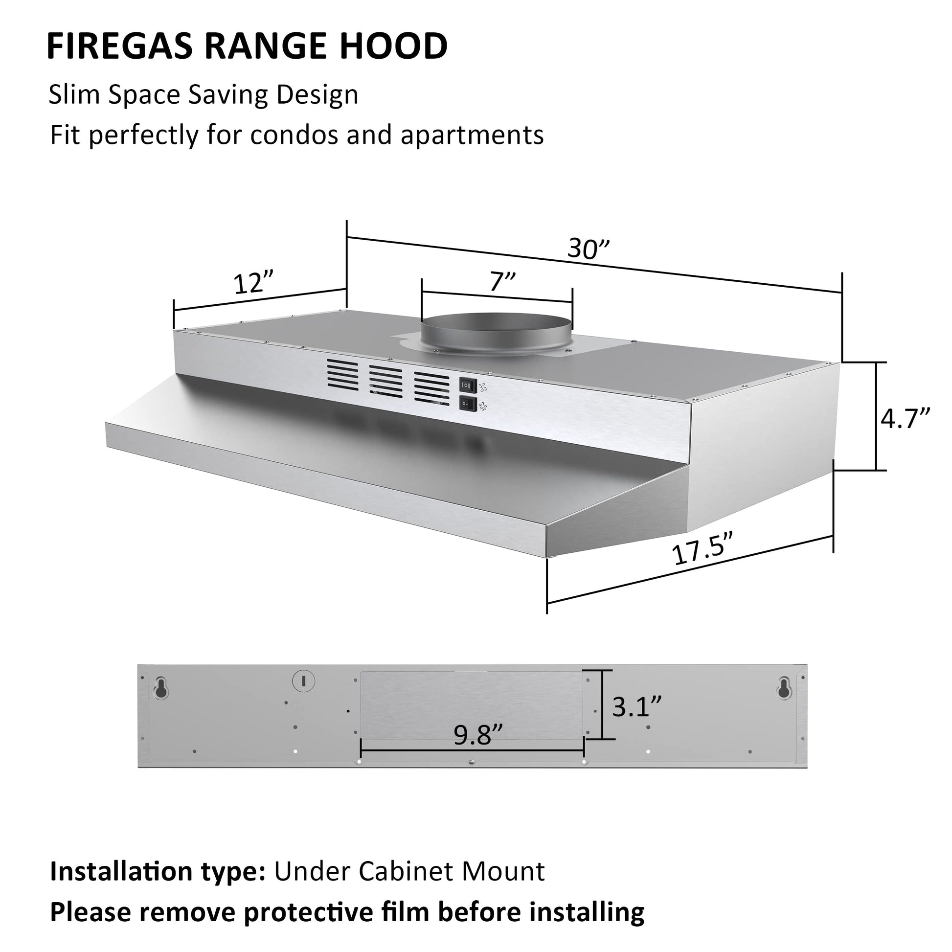 FIREGAS 30 inch Range Hood Under Cabinet, Ducted/Ductless Convertible Stainless Steel Kitchen Range Hood with Rocker Button Control, 2 Speed Exhaust Fan, 300 CFM Aluminum Filter Included