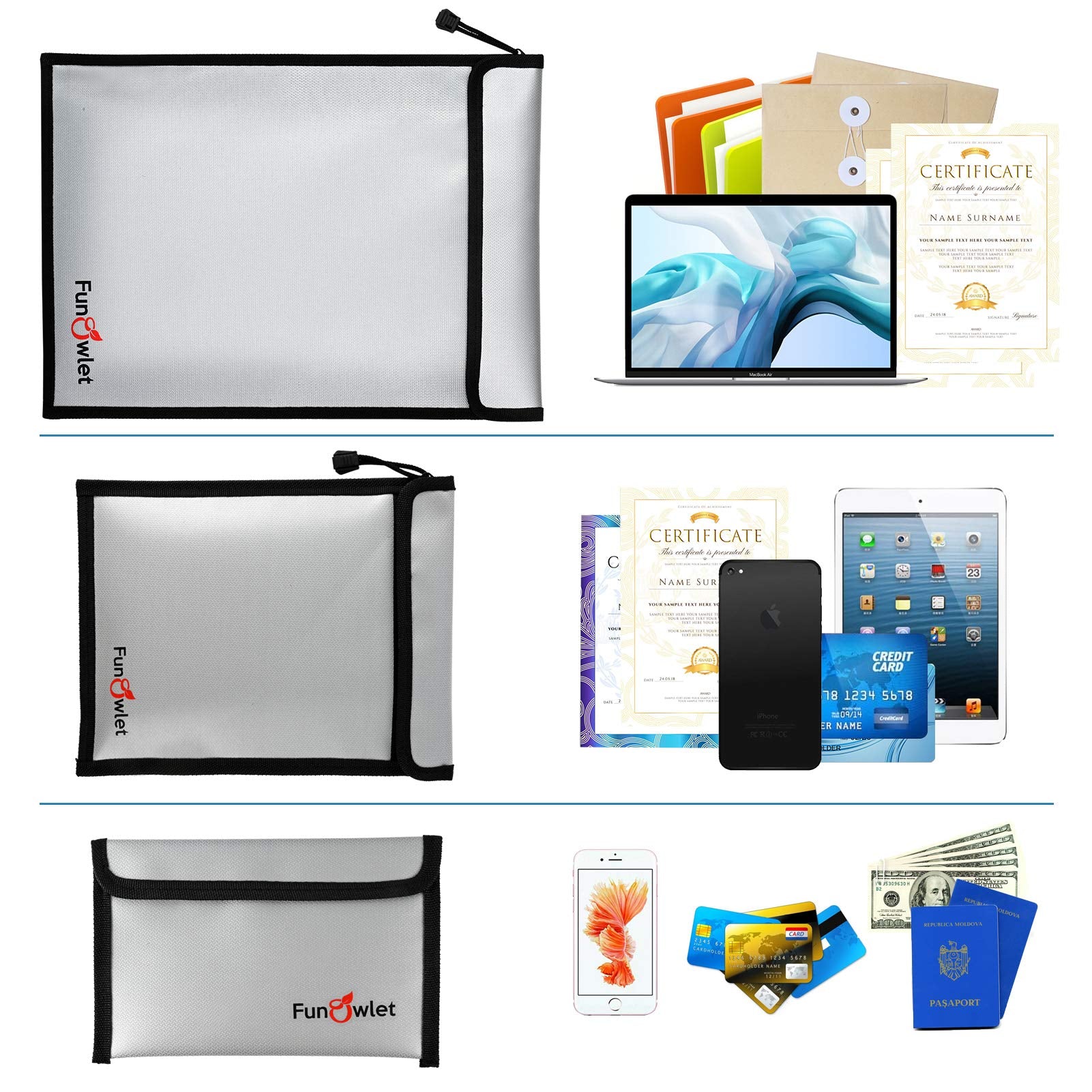 • 3 DIFFERENT SIZE FOR DIVERSE DEMAND: The set includes 15 x 11 inches fireproof document bag, 10 x 7.8 inches fire proof envelope bag and 8 x 5 inches small fire proof wallet bag . Large capacity & widely used, they can store all valuables include bank deposit,legal documents,cash,coin,credit cards,letters,precious photos,marriage certificate,passport and so on.