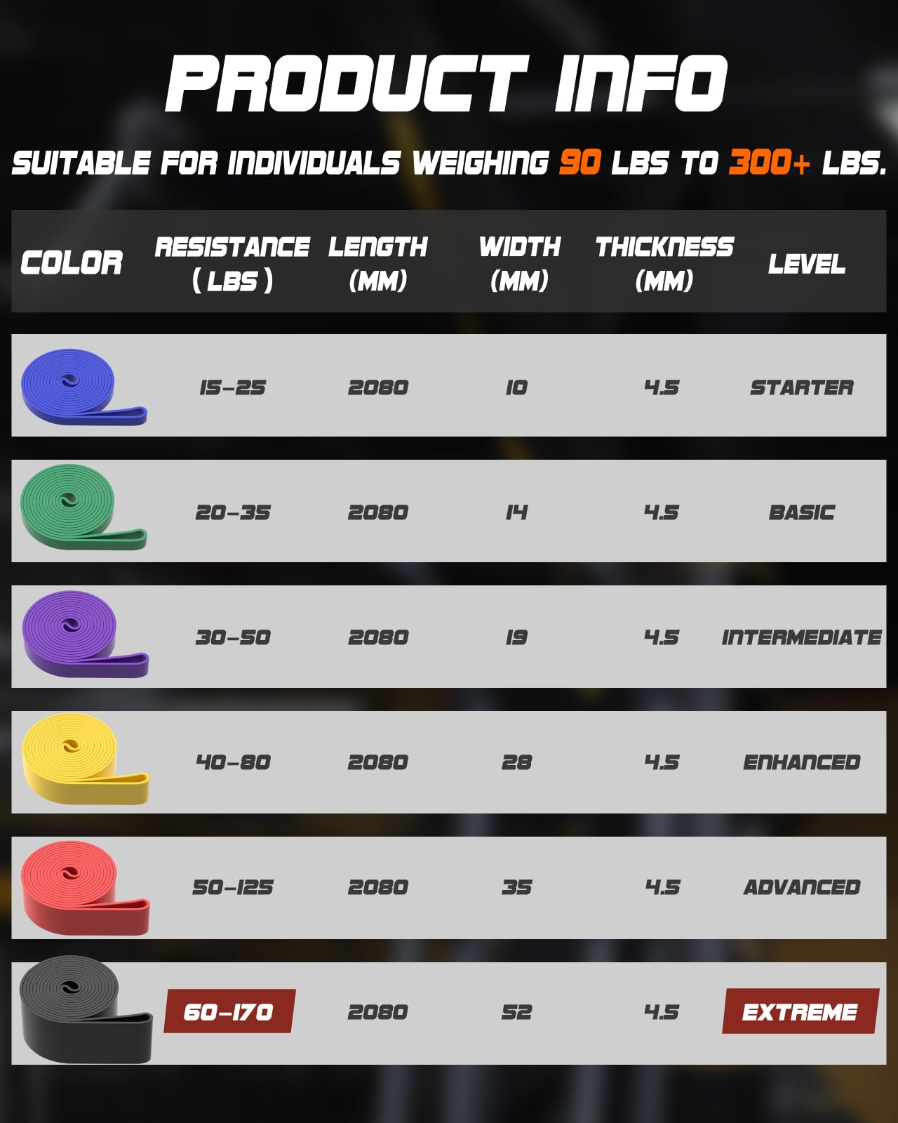 • 6 Resistance Levels: Our Pull Up Resistance Band Set includes 6 bands color-coded for different resistance levels: Blue (15-25 lbs), Green (20-35 lbs), Purple (30-50 lbs), Yellow (40-80 lbs), Red (50-125 lbs), and Black (60-170 lbs). Ideal for users weighing 90 lbs to 300+ lbs.