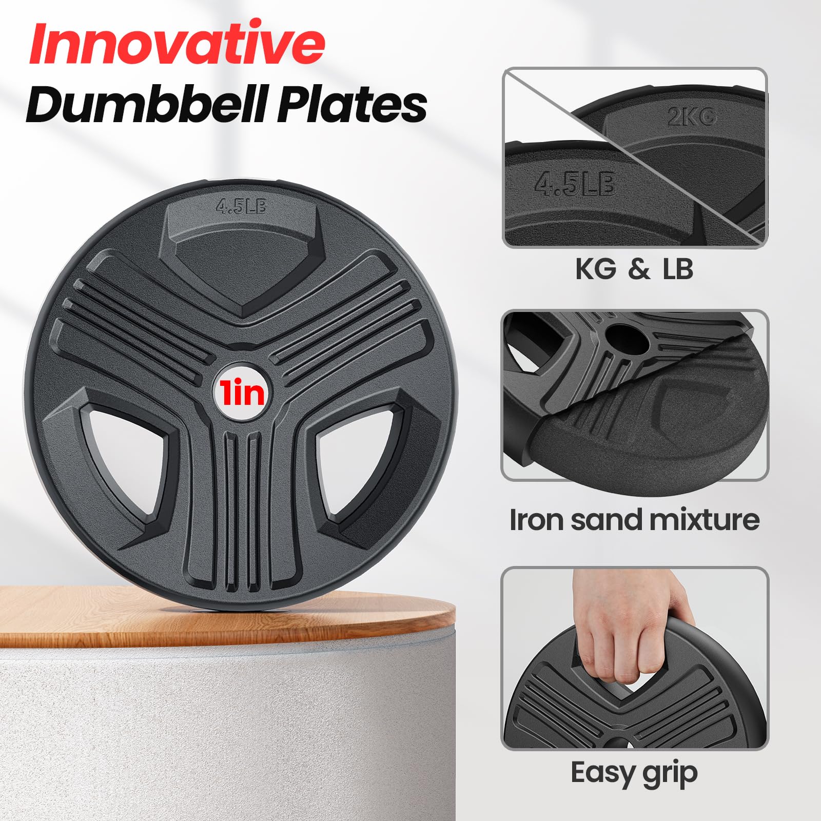 • 【Innovative Dumbbell Plates】Innovative dumbbell plates feature dual KG & LB units, eliminating the hassle of weight conversion. Constructed from high-quality PE, these plates absorb shock and protect floors. Deep grooves ensure easy grip. The rust-free and odor-free interior is made from a mix of cement and iron sand.