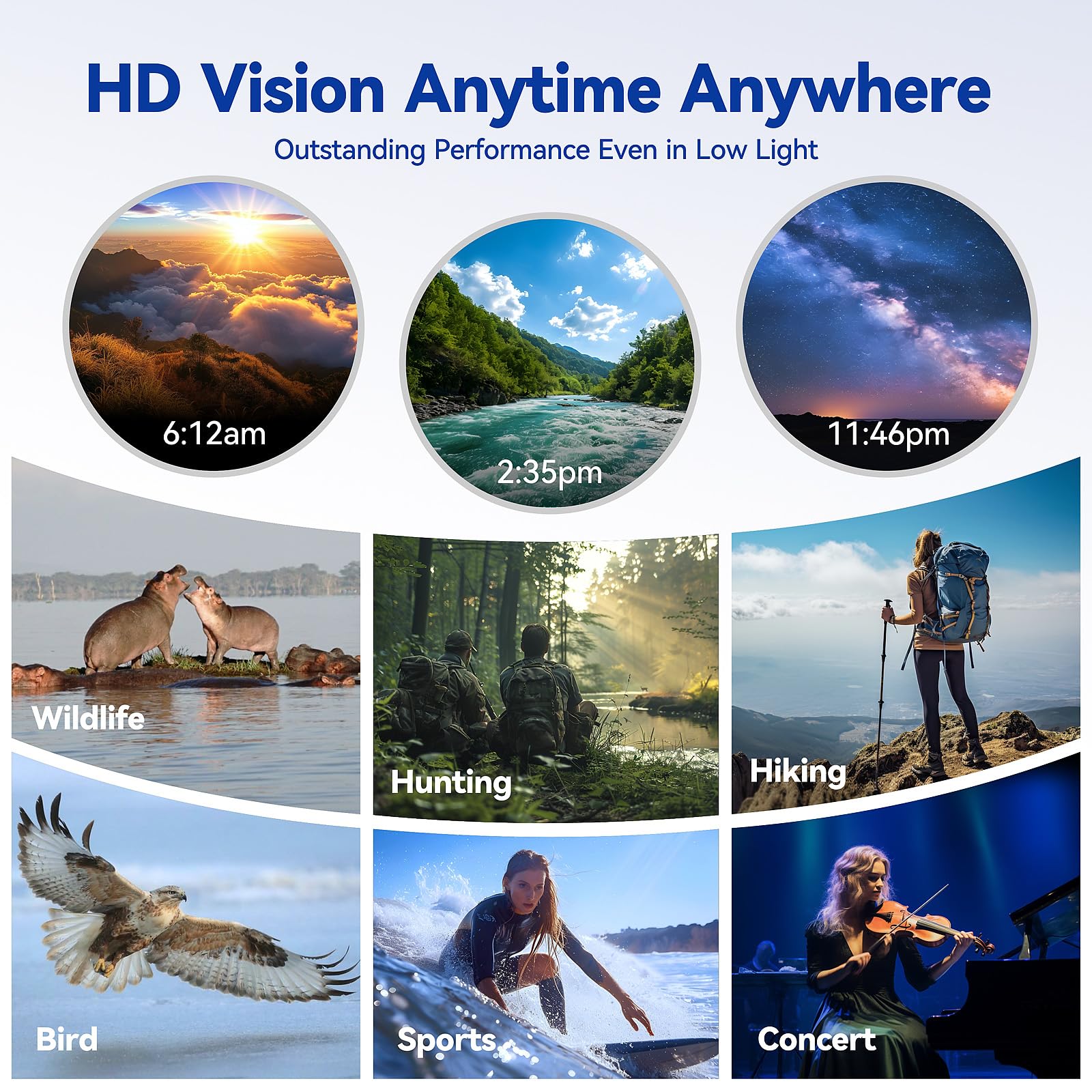 • Adventure-Ready, Rain or Shine: Built for explorers: Daily waterproof construction survives sudden storms, with fogproof seals and shockproof rubber armor that laughs off rocky trails. At just 1.1 lbs, these compact binoculars slip into any backpack. Music concerts? hunting or sunrise bird watching? You'll always travel light and miss nothing