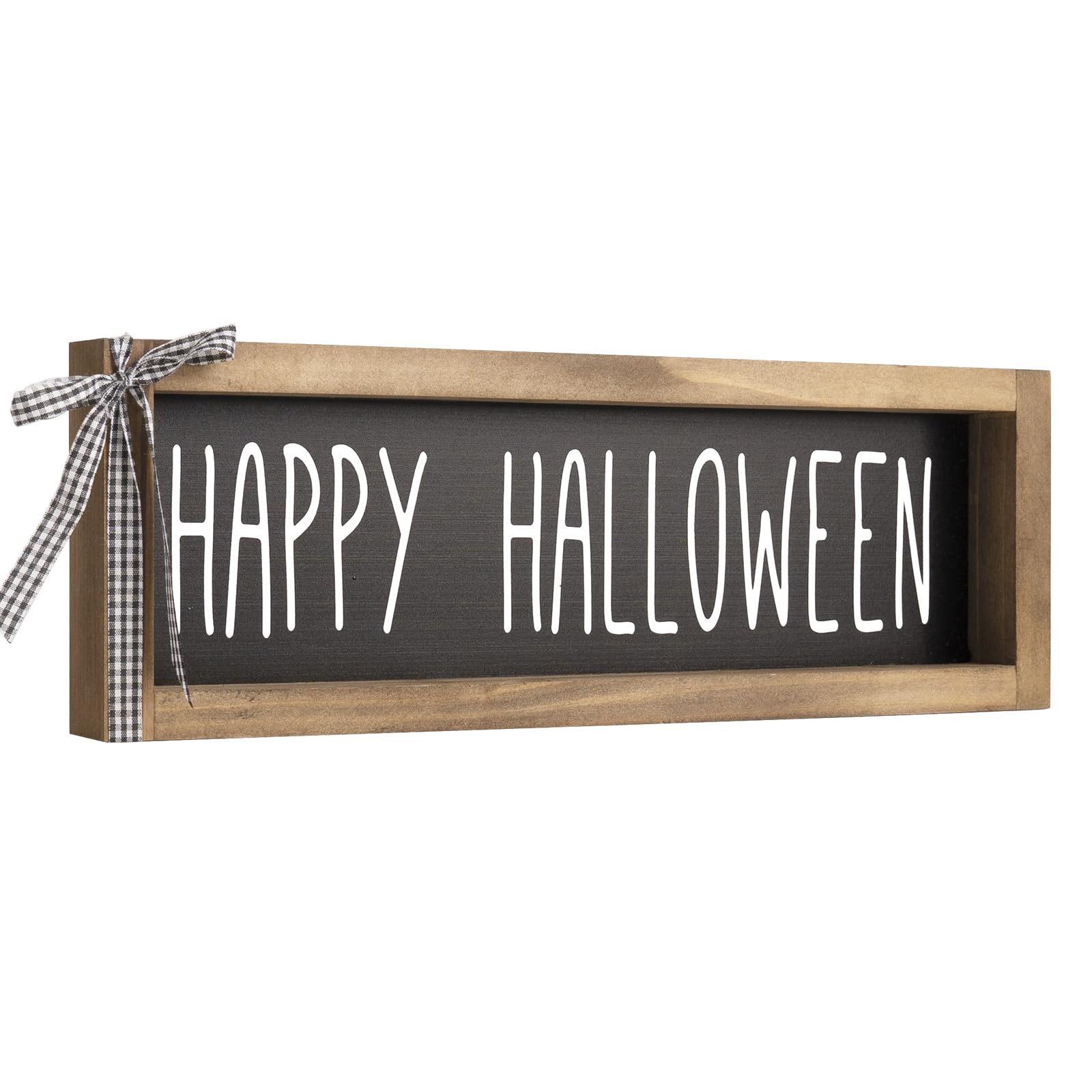 Details: Halloween plaque size is 13*4.5*1.2 inch, solid wood with frame. This wooden sign has a brown border and a black background with 'Happy Halloween' printed in white lettering and can be used as a table centerpiece.