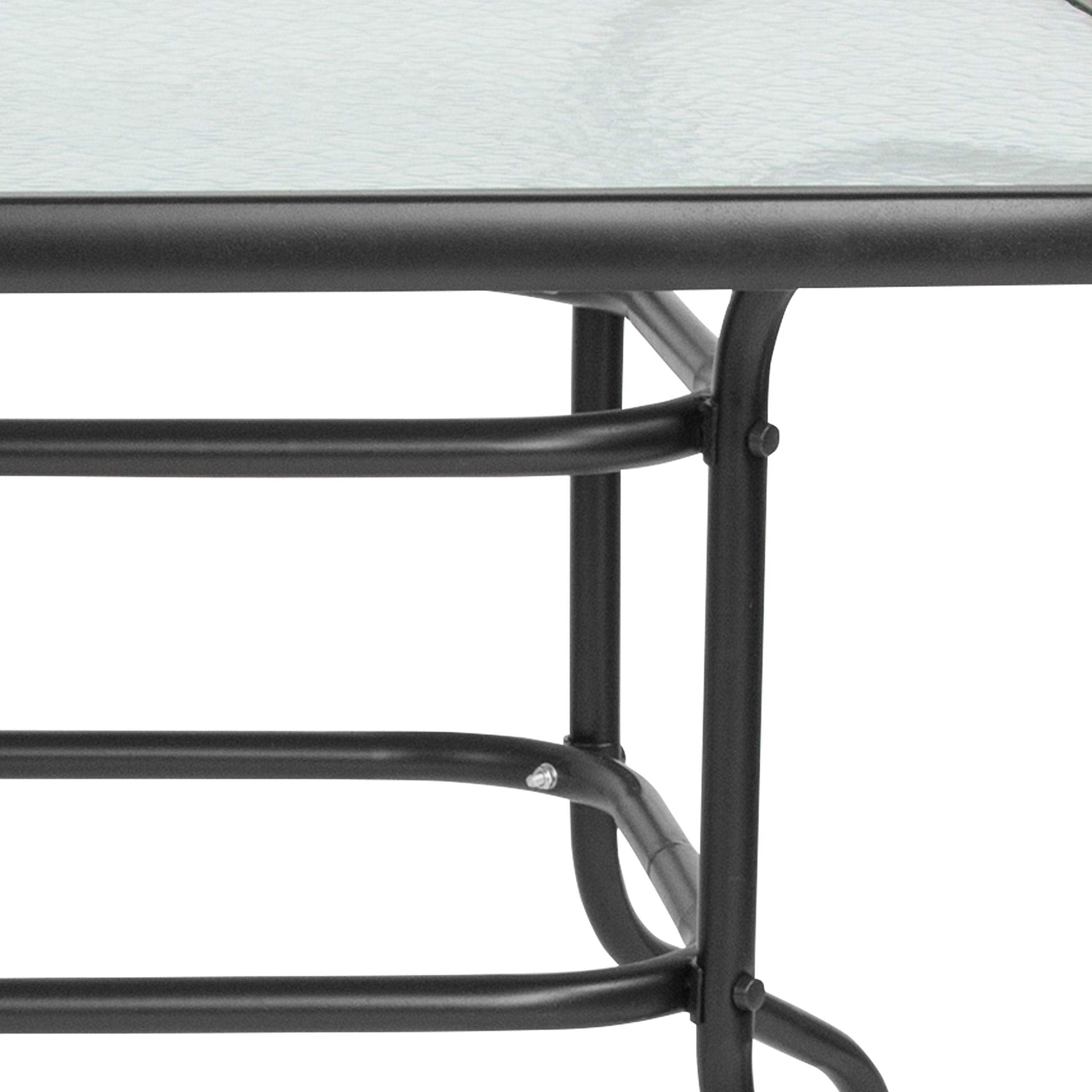Details: Dine alfresco in the comfort of your outdoor living space with the Flash Furniture Tory Rectangular Tempered Glass Metal Table. This patio table makes it easy to enjoy meals and conversations with friends and family in your backyard, patio, sunroom, deck, porch, or other outdoor area. It boasts a beautiful designer rippled glass tabletop that is smooth to the touch to keep items level, so you can serve meals outside with no worries. The convenient umbrella hole allows you to purchase your desired umbrella to add your own touch of style to the table and shield you from the sun this summer (umbrella not included). Constructed with a durable black powder-coated metal frame, this outdoor dining table withstands the elements for years of quality use, and the protective plastic floor glides make it easy to move the table. This rectangular patio table measures 31.5'W x 55'D x 27.5'H and can be paired with our indoor/outdoor dining chairs for a complete set.