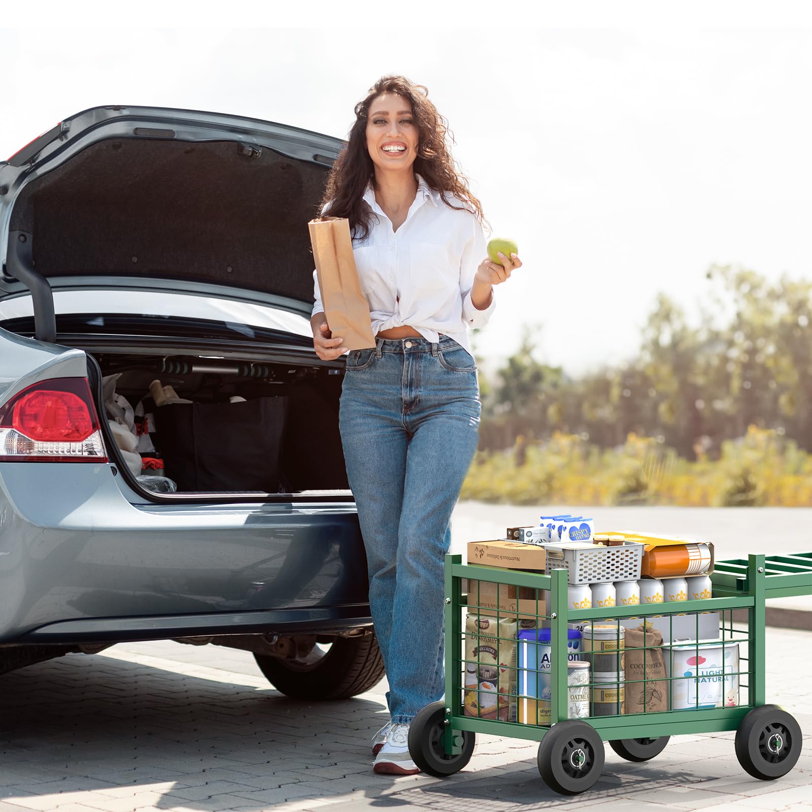 • Easily transports with wheels: The multi-use garden wagon features sturdy rubber tiers that are 4.7” in diameter, and its built-in handle enables you to travel through various terrain effortlessly. Its easy maneuverability is great for both kids and seniors