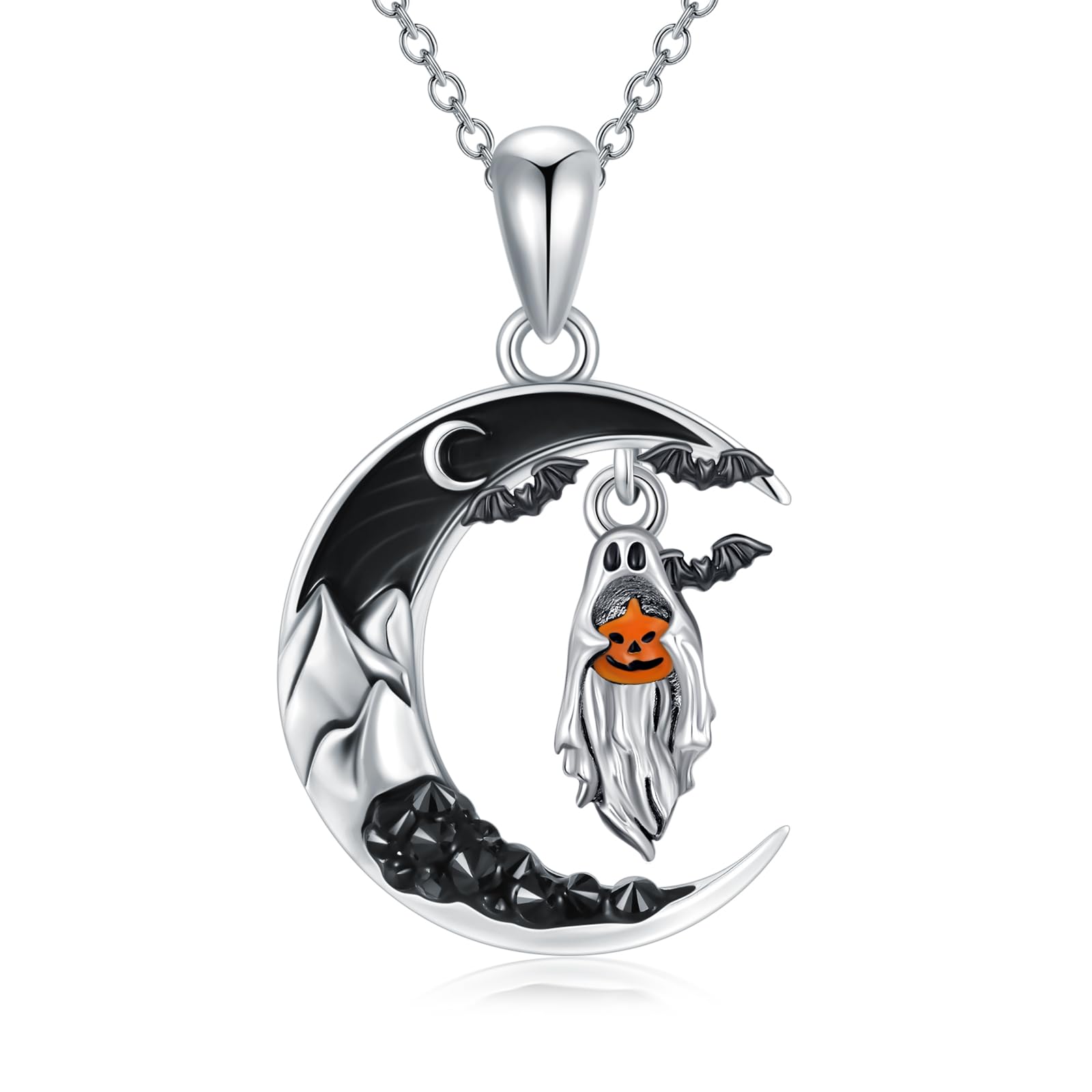 Flpruy Halloween Ghost Necklace 925 Sterling Silver Black Crescent Moon Bat with Pumpkin Pendant Halloween Goth Jewelry Gifts for Women