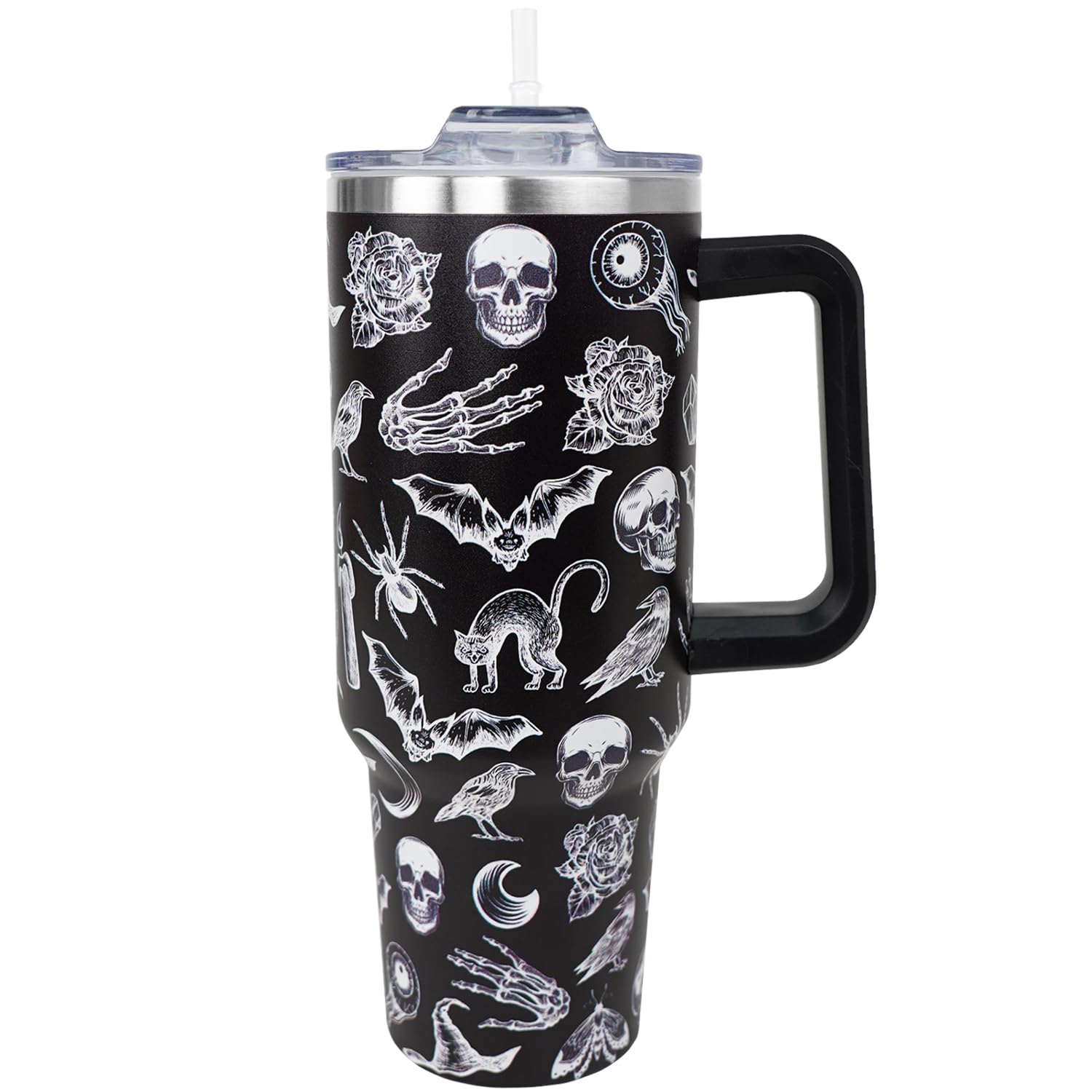 • Goth Tumbler: This goth tumbler is made of food-grade-quality stainless steel. And the stainless tumbler is printed with a clear goth theme pattern, the beautiful unique pattern design makes it creative. Includes a 40 oz tumbler with handle, a threaded lid, and a straw, which can make you drink in two ways.