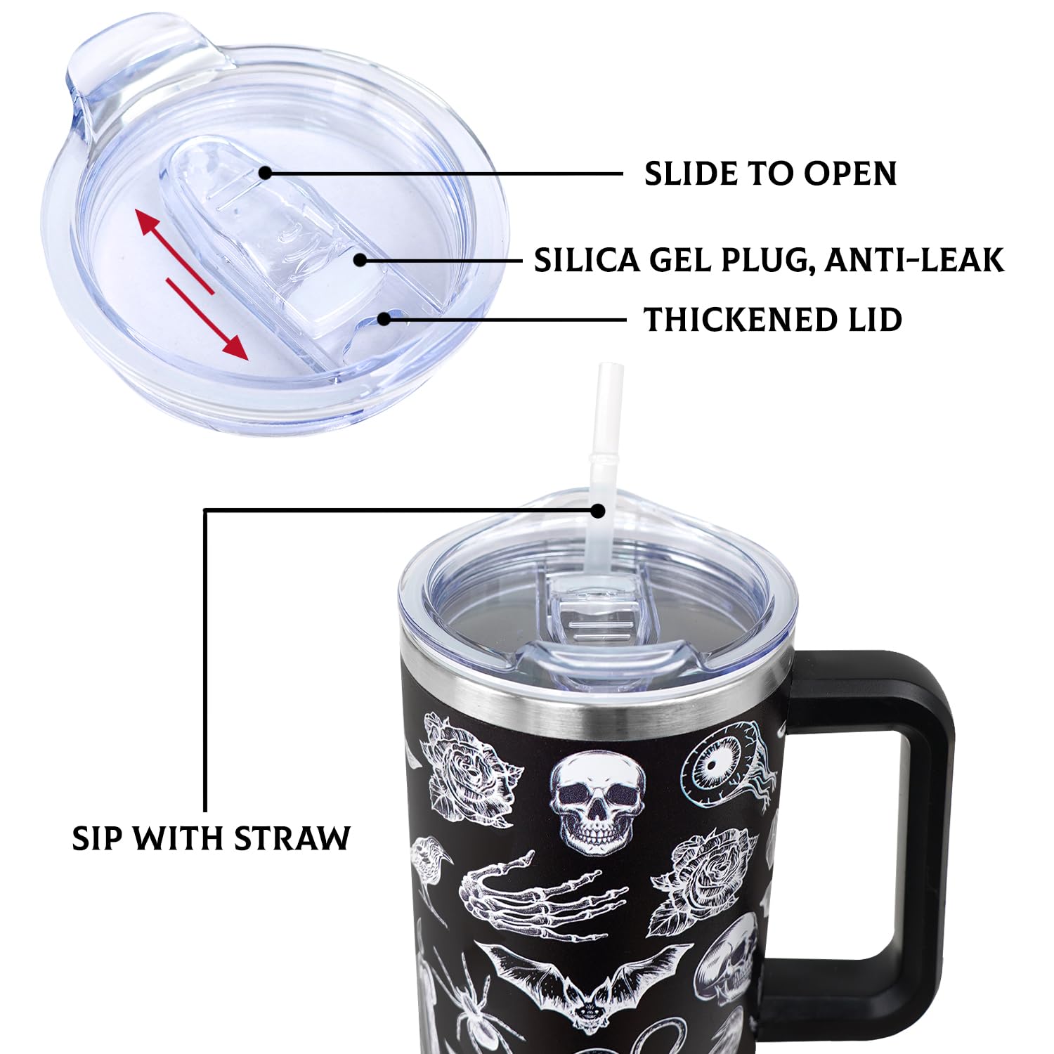 • Leak-Proof Coffee Travel Mug: The lid seals tightly with a rubber seal gasket, and the threaded design makes the lid not easy to fall off. The straw-friendly opening can be covered with a sliding closure to prevent spills. It's a good idea as graduation gift, birthday gift, mother's day gift, father's day gift, Christmas gift, thanksgiving day gift, housewarming gift, halloween gifts, and goth gifts for women.