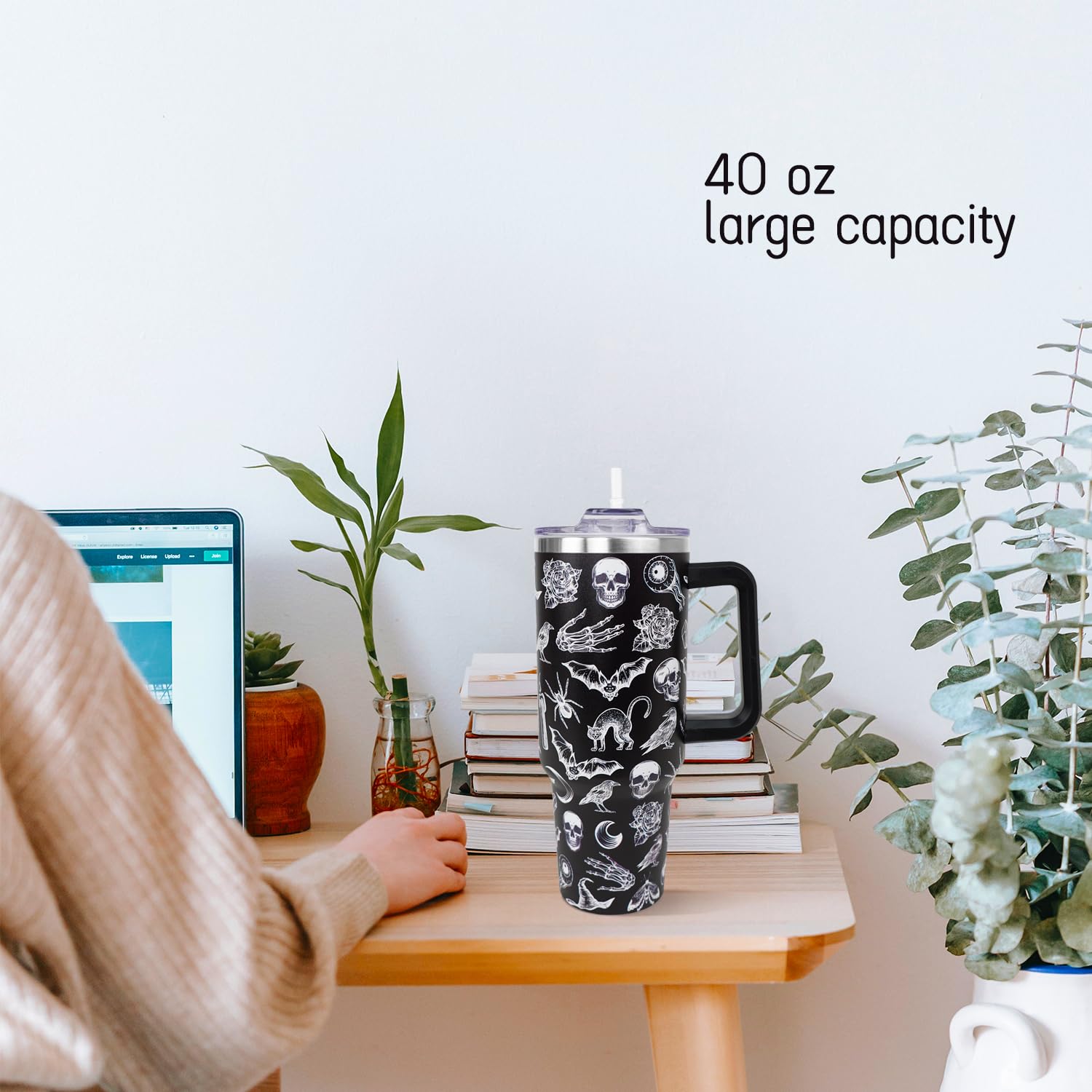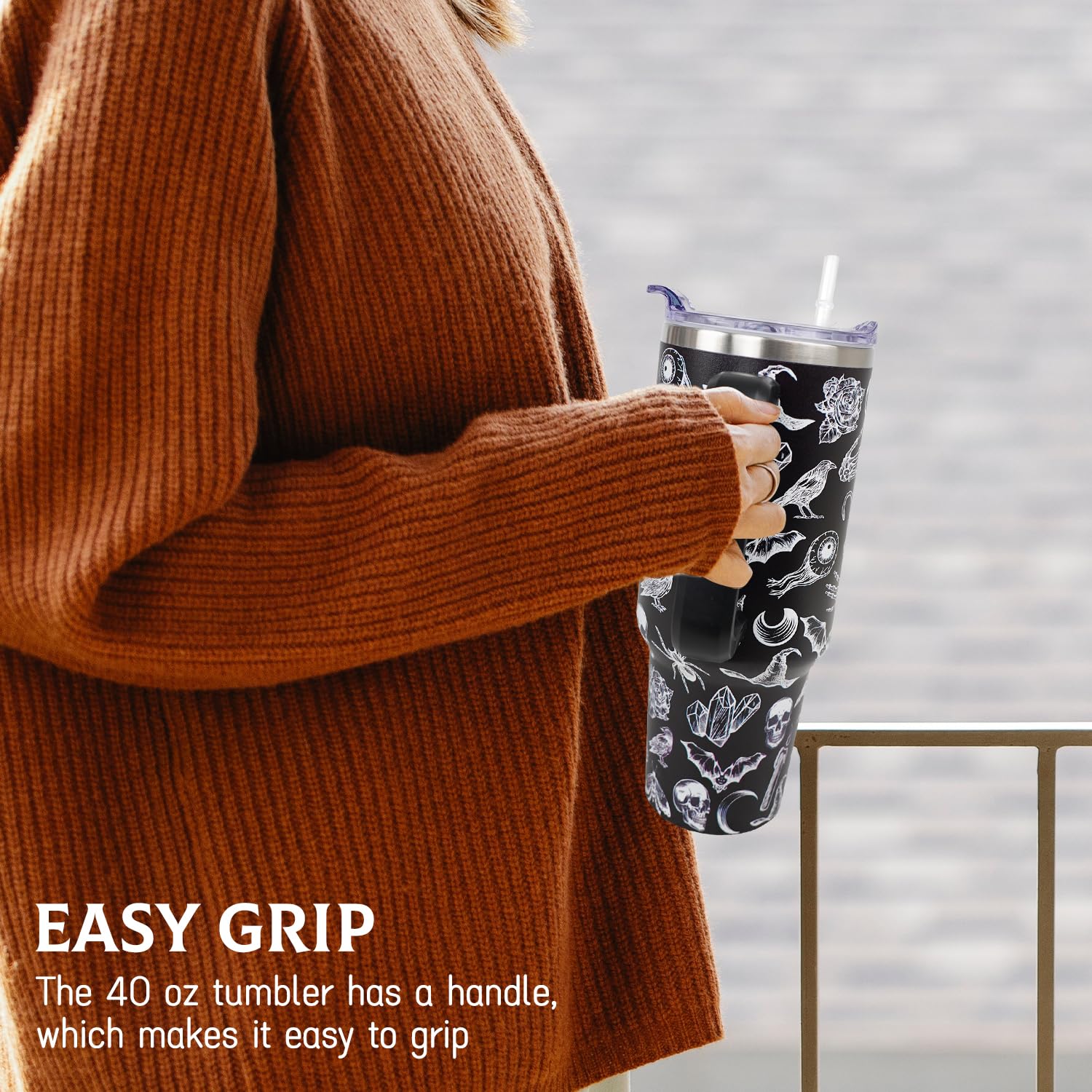 • Easy to Care: The stainless steel 40 oz tumbler with handle and straw has a large 40oz capacity which is easier to clean. The witchy goth print water bottle coffee tumbler cup travel mug 40 oz insulated tumbler stainless steel tumbler can take your beverage with you wherever you go.
