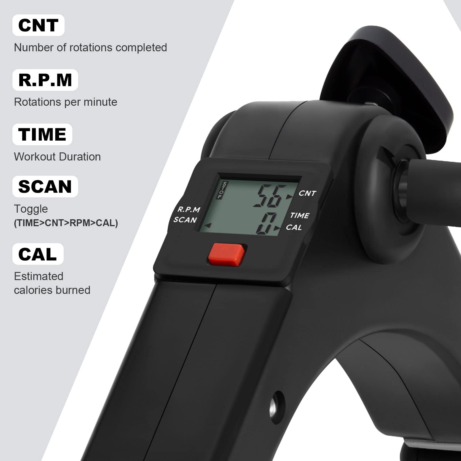 • 【LCD Screen Display】: The under desk bike pedal exerciser with removable multifunction LCD monitor display, It is very clear and visible, including RPM (Rotation per minute), counting, exercise time and calories burned.