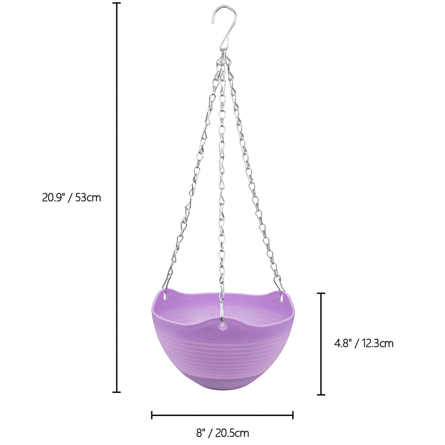 • Dimensions: The hanging planter is 8' dia. x 4.8' height (20.5cm x 12.3cm). Length of chain is 16.9” / 43cm. Total height is 20.9” / 53cm. The planters is made of premium quality plastic that is lightweight and resist damage from sun, rain, and impacts.