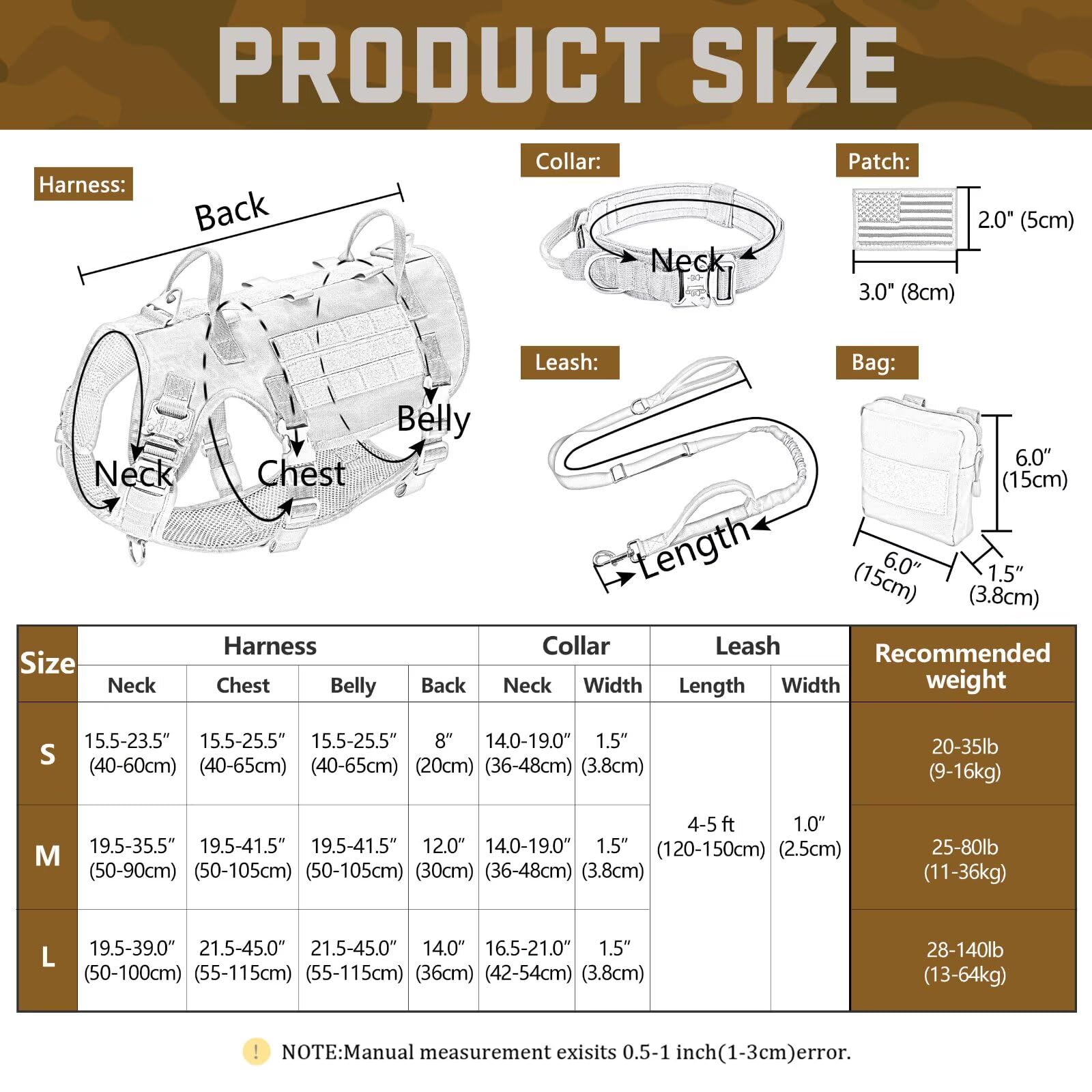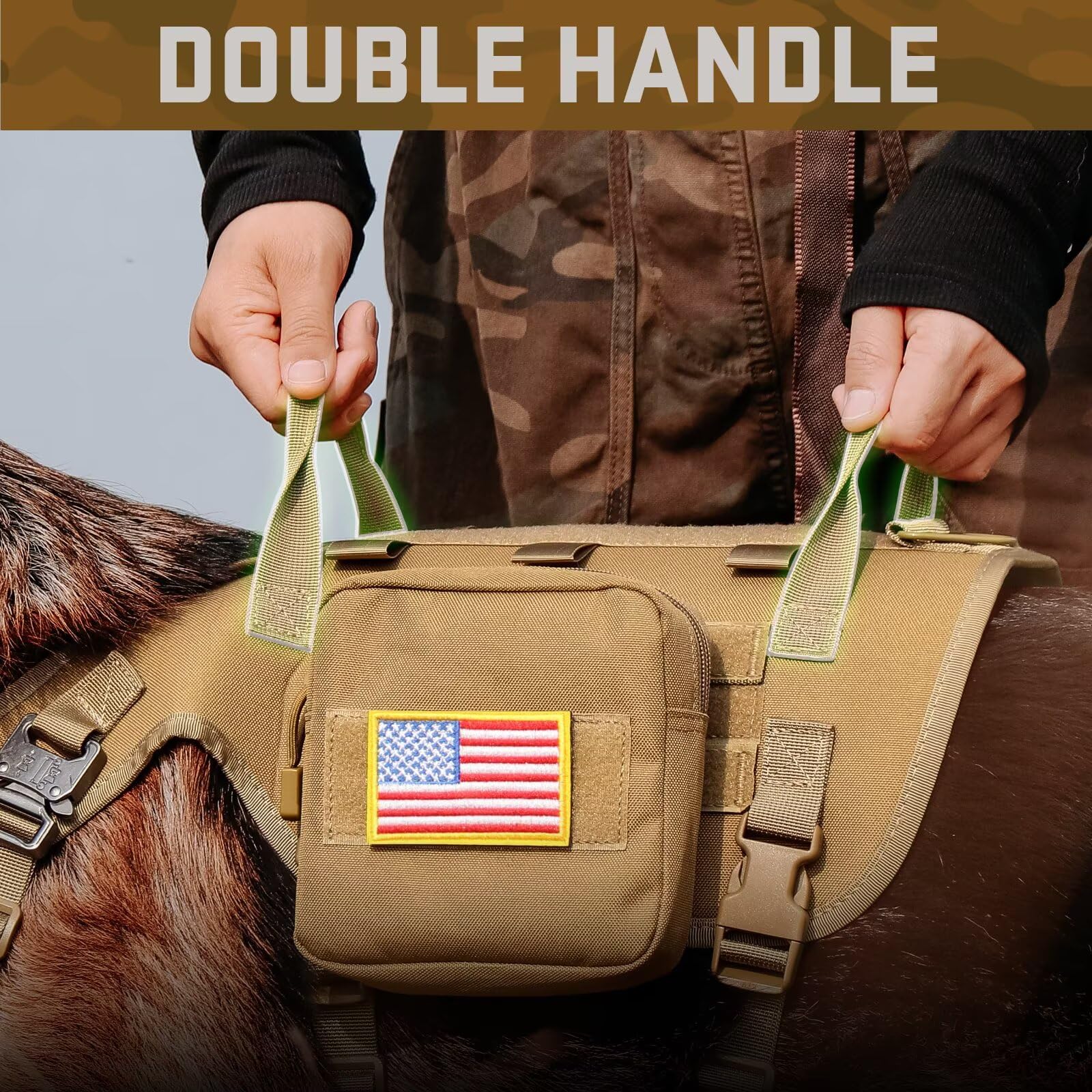 • All-in-One Tactical Bundle for Active Dogs: 1 military-grade dog harness,2 MOLLE backpacks,1 tactical collar,1 shock-absorbing bungee leash and 3 hook and loop patches.Perfect for hiking,training or urban adventures--store treats,gears in the pouches
