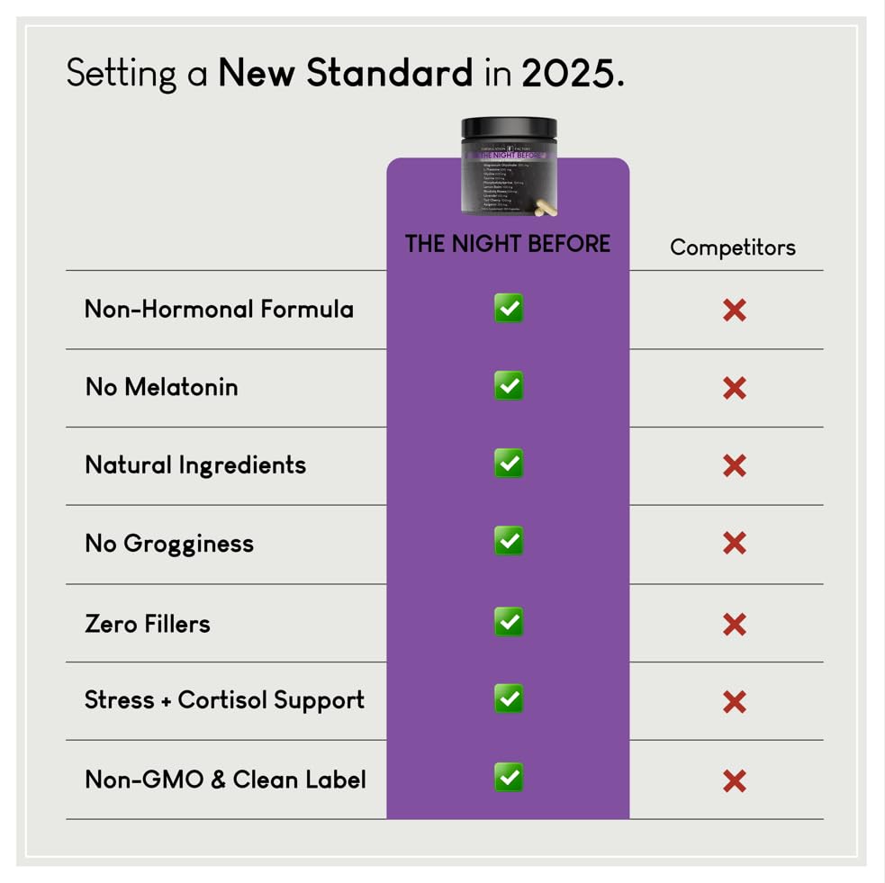 • [Non-Hormonal, Science-Backed Formula] Unlike melatonin-based supplements, The Night Before features 10 natural, non-hormonal ingredients like Magnesium Glycinate, L-Theanine, and Phosphatidylserine, designed to work with your body’s natural rhythms for restful, rejuvenating sleep.