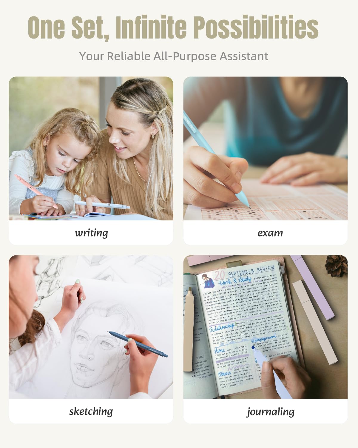• All-in-One Bulk Pack: This pack includes 12 pastel colored highlighters, 6 adorable mechanical pencils, 5 black ink gel pens, 5 gel pen refills, a charming pink pencil pouch, 3 jelly erasers, 9 cap erasers, and 6 tubes of lead refills; It's the ultimate collection of multifunctional stationery essentials for office and school supplies
