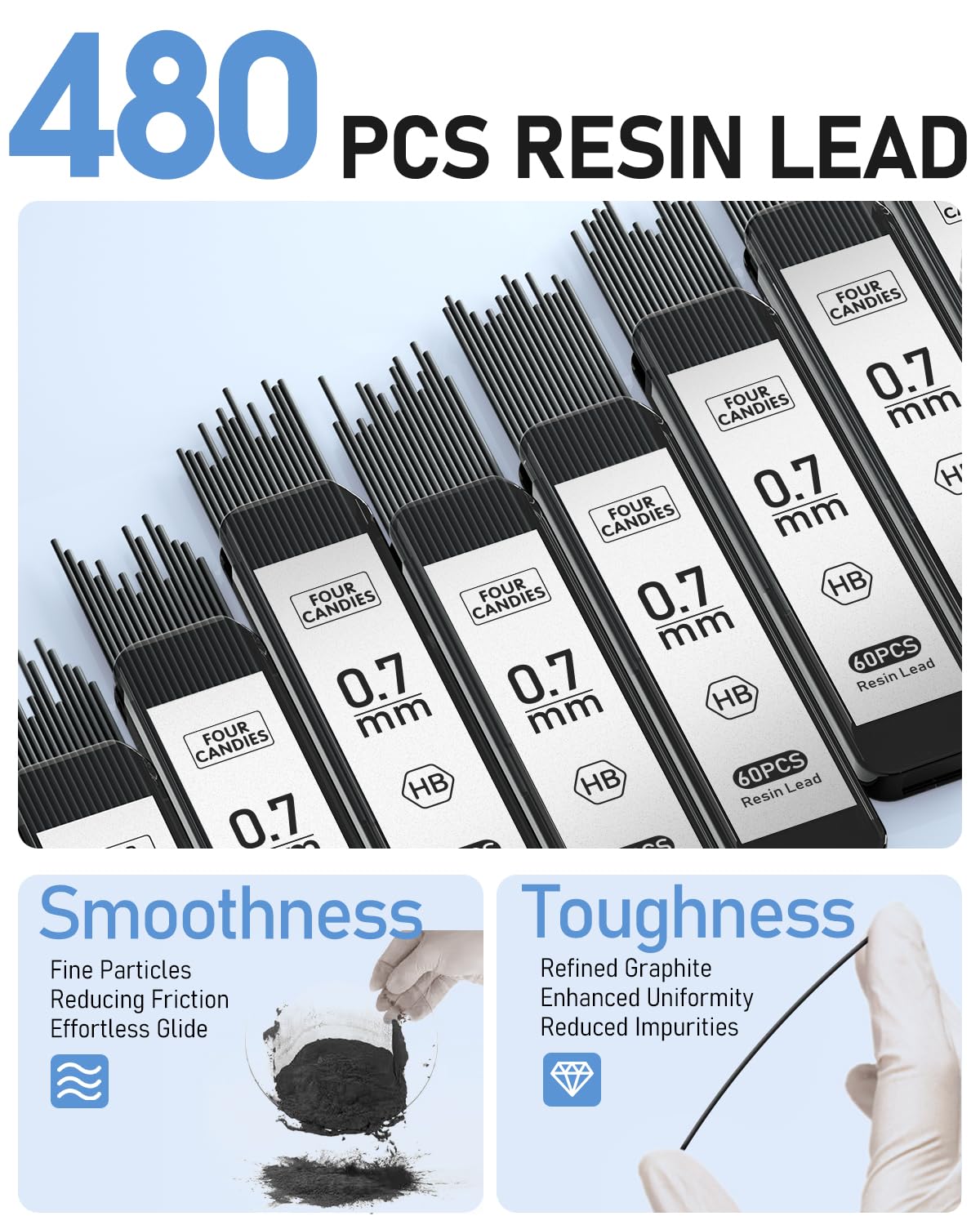 • 480PCS Resin Lead: 8 tubes of 60pcs super capacity leads. A more durable resin lead which doesn’t require sharpening and is not easy to break at the tip or break in the shaft, provides ultra-smooth writing and clear dark lines.