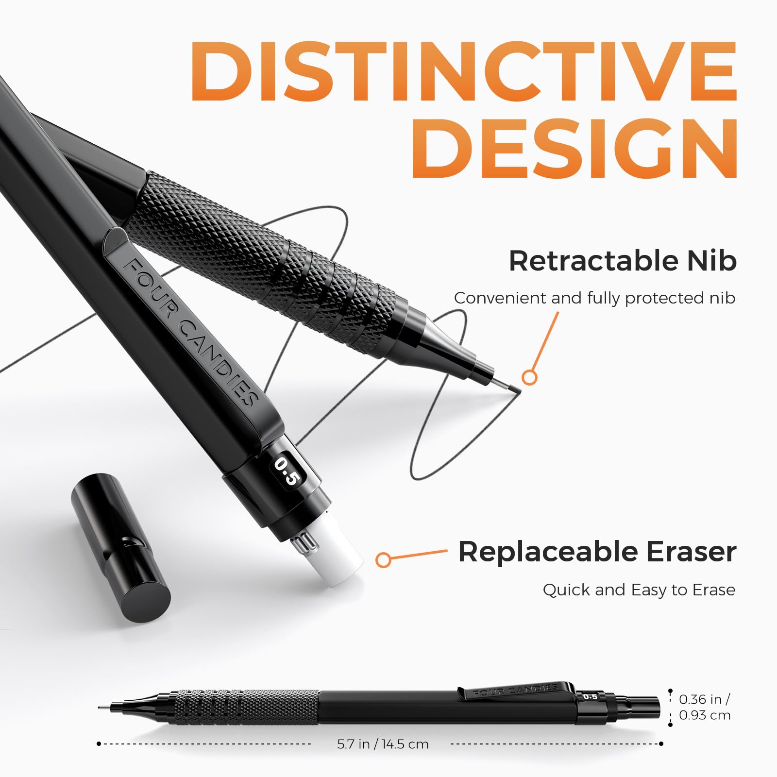Four Candies Metal Mechanical Pencil Set, 3PCS Art Drafting Pencils 0.5, 0.7, 0.9MM & 2PCS 2MM Mechanical Drawing Pencils with 420PCS Leads (4B 2B HB 2H Color) for Writing Sketching Drawing (Black)