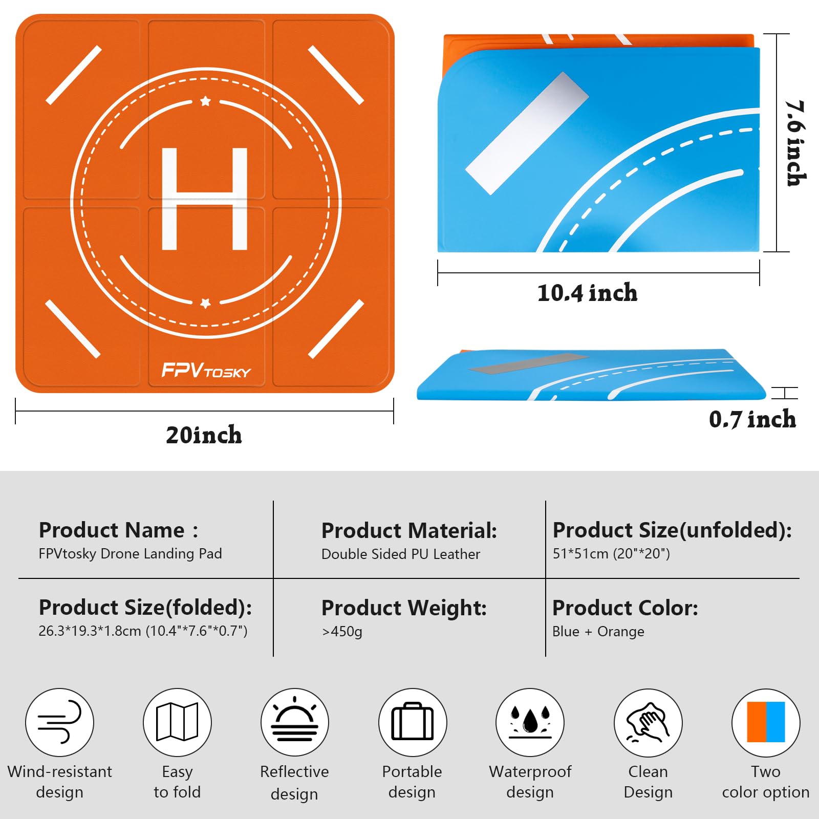 • 【Portable & Safer】 20 * 20 inch drone landing pad, fits most different size drones. The foldable design makes this drone landing pad easy to carry and can be easily stored in most protective cases or backpacks.