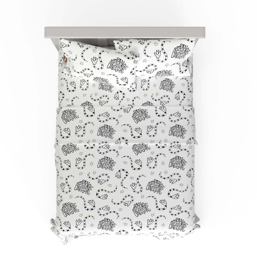 • BEETLEJUICE DESIGN: Summon quirky vibes into your bedroom with our Beetlejuice sheet set! Crafted in crisp white, adorned with the iconic sandworm pattern, and accented with 'strange and unusual' words, it's a nod to the peculiar charm of the afterlife. Embrace the whimsy and add a touch of the bizarre to your nightly adventures in the comfort of your own bed.