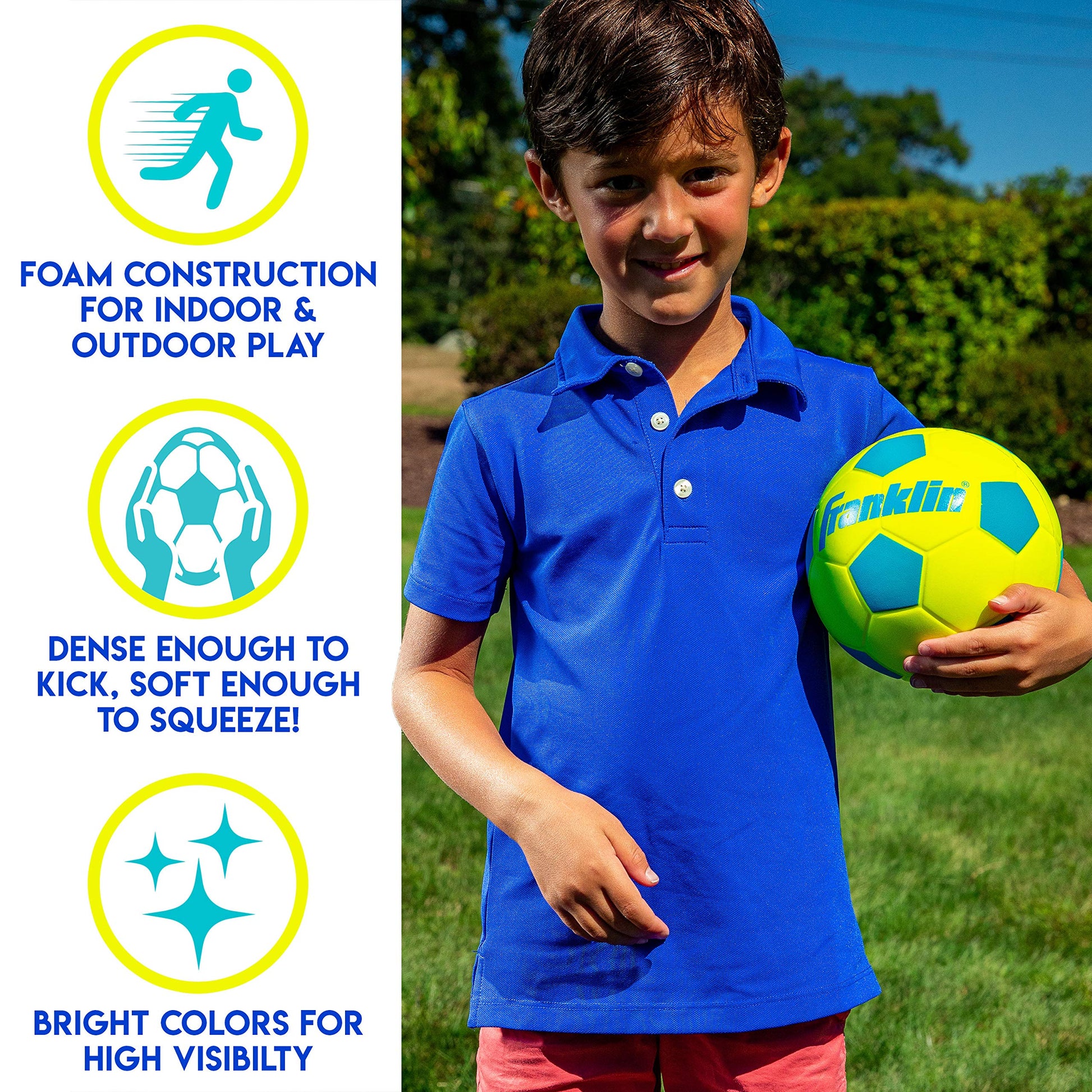 Details: The Franklin Sports 6.5-inch Foam Soccer Ball is the perfect ball for the backyard, the beach, your neighborhood barbeque, or any tailgate play! Created with the fun of the sport in mind, the soft foam ball provides younger athletes with a real soccer feel to promote confidence and get involved in the game! This is an excellent tool for kids, adults, and friends of all ages to play together! The bright neon colors make it easy to see in any kind of lighting! Get out and play with the best foam soccer ball in the game! Perfect for indoor or outdoor play.