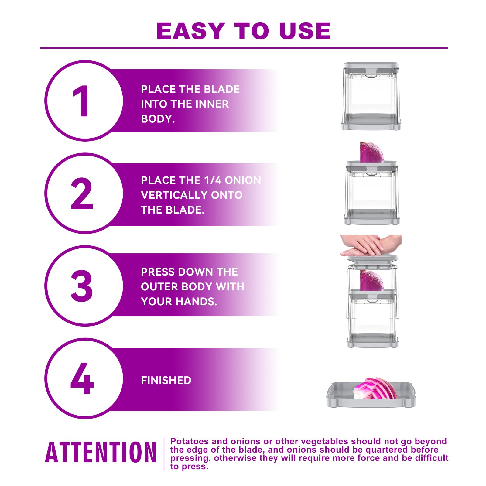 • 【Fruits And Vegetable Slicer】 CrazyQueen onion slicer is designed for fruits and vegetables. This veggie cutter slicer is made of high quality stainless steel, with a sharp and durable blade. This onion slicer is easy to clean, and it is dishwasher safe. ATTENTION: Can't connect the Blade Press Plate with Press Plate directly without the Outer Body, this is the mainly reason that blades won't lock into place.
